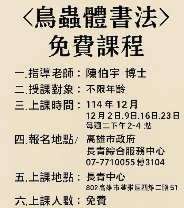《 鳥蟲體書法》免費課程開放報名 高雄長青中心限額 30 名 2025/12/01 - 張永漢報導 - 【記者張永漢/高雄報導】為推廣國粹藝術並活化長者學習生活,高雄市政府長青綜合服務中心將於 114 年 12 月開設《鳥蟲體書法》免費課程,由知名書法研究者、傳承...