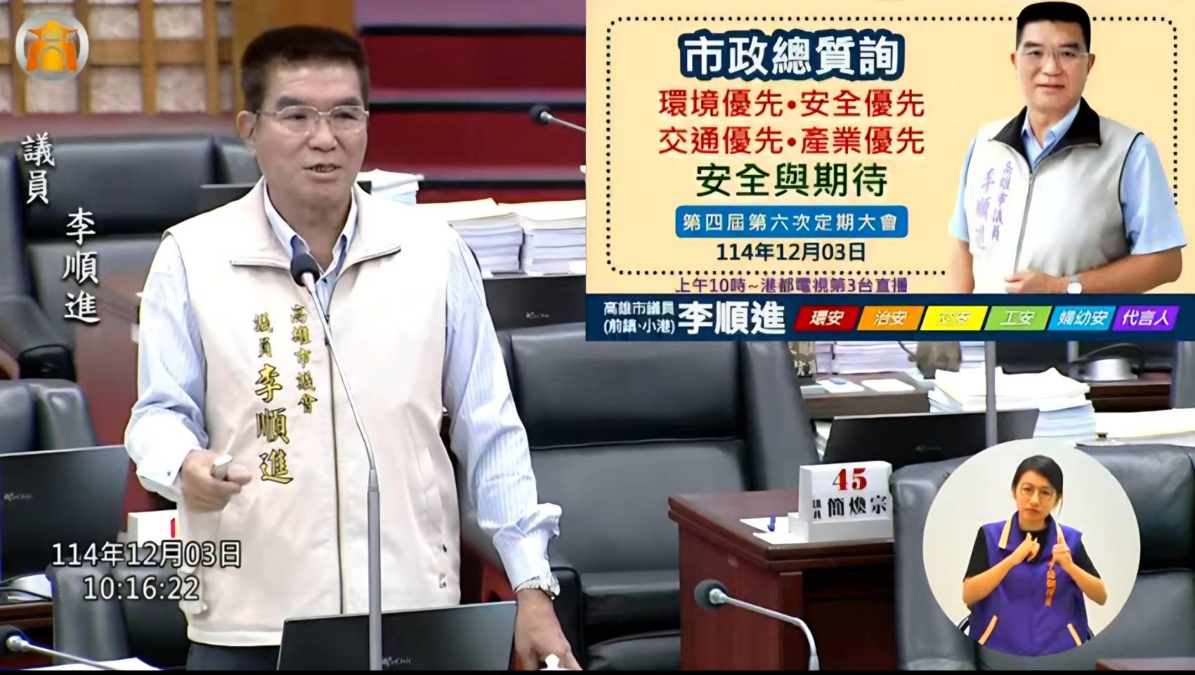 高雄市議員李順進市政總質詢:盼加速推動小港前鎮建設、遷村經費提高至千億、市府允諾全力加速 2025/12/03 - 張永漢報導 - 【記者張永漢/高雄報導】高雄市議員李順進3日於議會市政總質詢中,以環境優先、安全優先、交通優先、產業優先等四大面向為主軸,積極力促市府推動小港、前鎮發展,除提出...