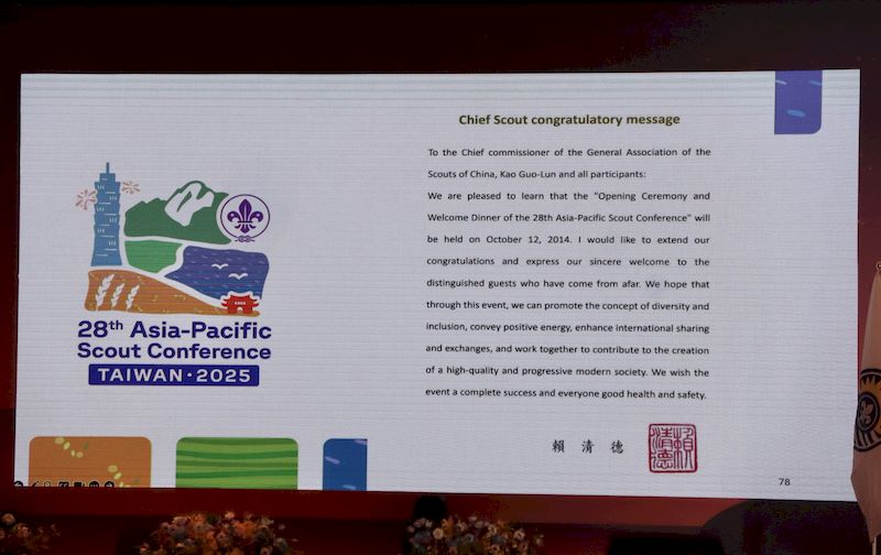 理事長讚揚亞太地區是全球最具活力與多樣性的區域,擁有如同世界大露營般繽紛的文化、語言與傳統,儘管如此,大家仍因一個共同的使命而緊密連結,也就是透過童軍,培育青年成為有責任感的公民與有同理心的領袖。