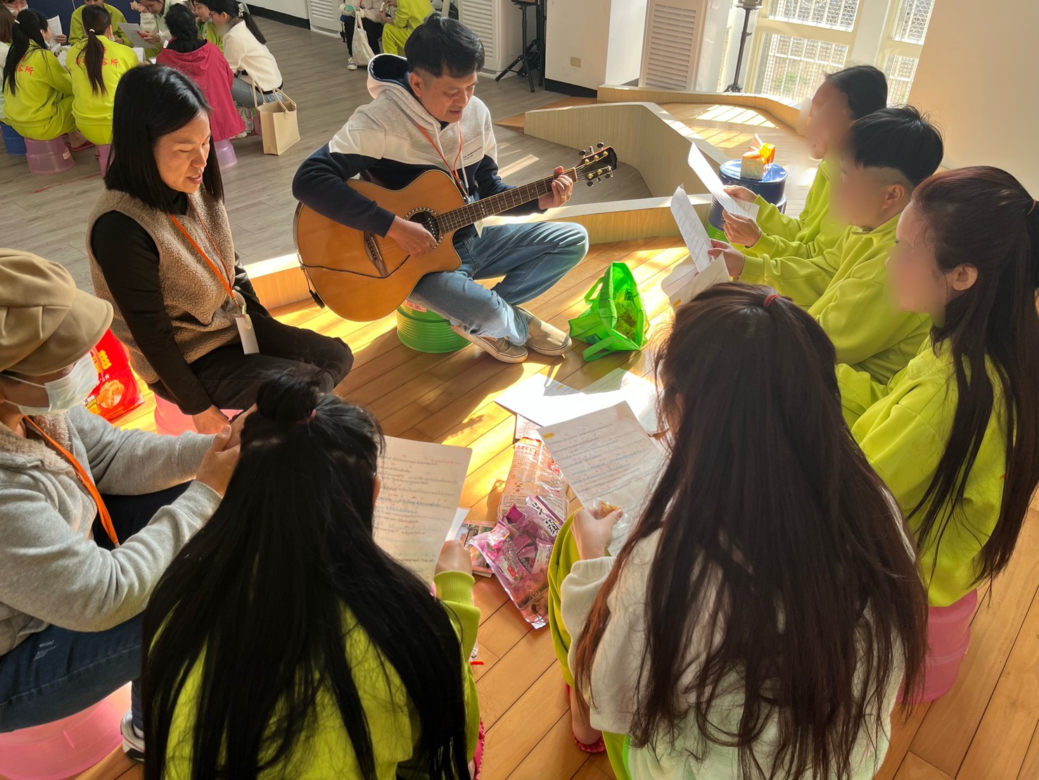 ▲圖:臺灣外籍收容人關顧協會人員彈吉他和受收容人歡唱(移民署南區事務大隊高雄收容所提供)