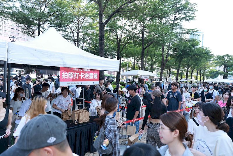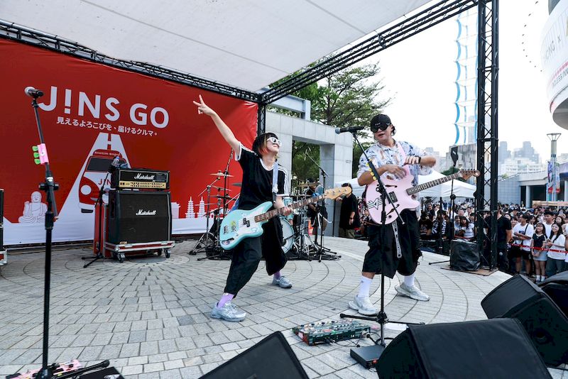 三位團員各自以眼鏡搭配舞台造型,展現不同個性。貝斯手大寶大讚「JINS 眼鏡超好看」,主唱閃亮更現場即興創作,用音樂唱出對JINS的喜愛。活動中,主持人豆比登帶領廣場上千名粉絲大玩「眼明手快」遊戲,有民眾展現驚人手速,一口氣抱走八支 JINS 墨鏡,引發現場驚呼連連。