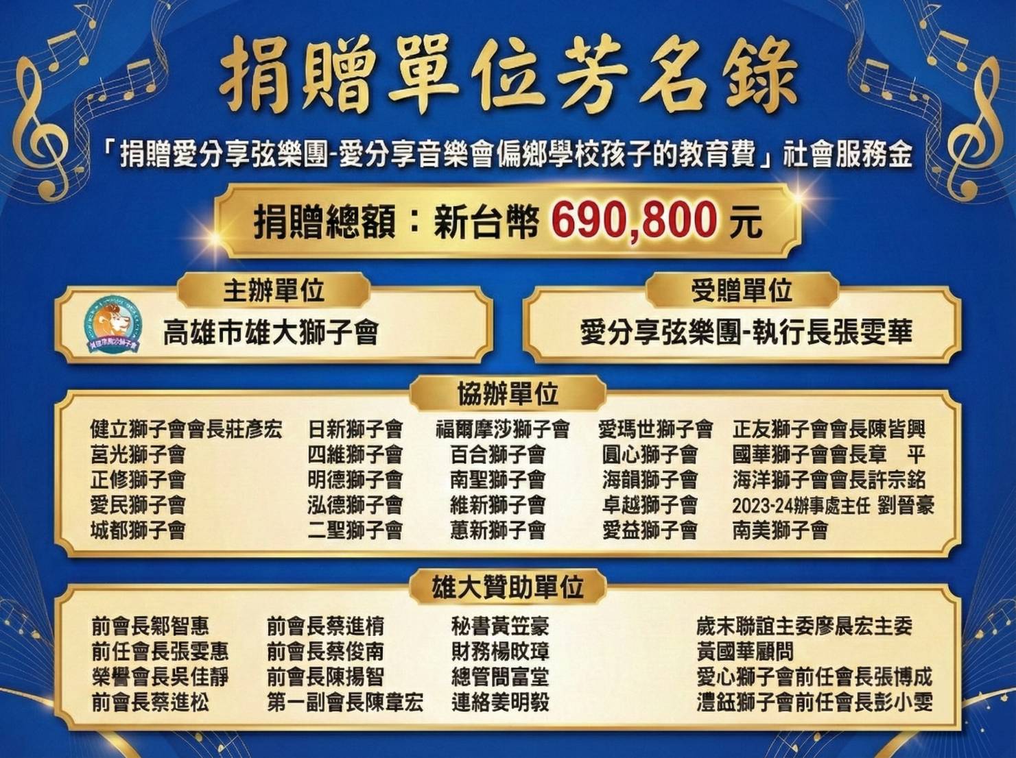 本次活動由高雄市雄大獅子會主辦,並獲得眾多友會與獅友的熱烈響應與協辦。活動當晚展現了獅子會高度的凝聚力,將愛心化為實際行動,捐贈教育基金予愛分享弦樂團,由執行長張雯華代表受贈。此筆款項將直接挹注於偏鄉教育資源,縮短城鄉差距,讓孩子們能無後顧之憂地學習與成長。