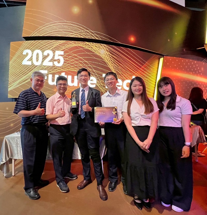 1. 高醫氣管內管位置異常警示系統,勇奪科研界奧斯卡 「2025未來科技獎」,由高醫人工智慧創新應用中心蔡明儒主任(右4)代表領獎。