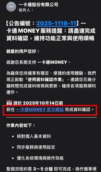 對此一卡通公司發布公告,指出近來詐騙集團假冒 iPASS MONEY,透過簡訊、E-mail或電話,謊稱「資料更新」、「帳戶異常」或「系統升級」,騙取用戶「簡訊/交易驗證碼」或個人資料,此類訊息均為詐騙,請用戶務必提高警覺,保護帳戶安全!並提醒用戶謹記「三不原則」:不透露驗證碼、密碼或個人資料;不點擊陌生連結或開啟不明附檔;不依隨陌生來電指示操作。如遇任何可疑情事,可立即透過客服協助查證,共同維護帳戶安全。