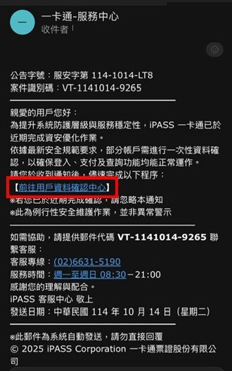 【記者張永漢/高雄報導】高雄市警方接獲報案發現詐騙集團近期假冒「iPASS一卡通電子票證公開司」名義發送釣魚簡訊,內容偽稱「帳戶異常」、「退款通知」或「卡片需更新」,並附上偽造的網站連結,誘使民眾點擊後輸入個資或信用卡資料,導致卡號遭盜刷、帳戶被竊用的情形頻傳。經統計高雄市關於釣魚簡訊(惡意連結)案類114年10月份受理共計32件,其中「iPASS一卡通」即佔18件(為該案類56%),且財損金額已逾新臺幣100萬元。