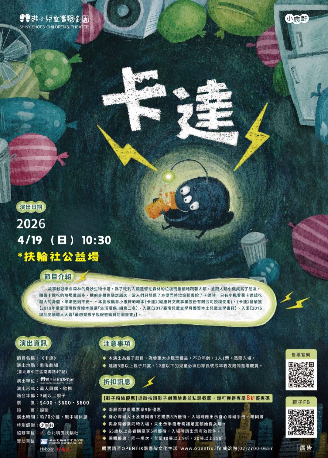 【記者張永勳/ 台北報導]由「公益傳家」發起,在成長文教基金會附設鞋子兒童劇團4/17-4/19 演出中,台北鳴鳳扶輪社包場的「卡達」戲劇,今年的公益場將於115年4月19日上午10:30展開,演出收入將依照觀眾投票比例,捐給三個公益團體,讓您與孩子在共同欣賞寓教於樂的戲劇的同時,也可以一起參與在公益活動中,讓愛透過您們的參與可以延續在社會的角落處。