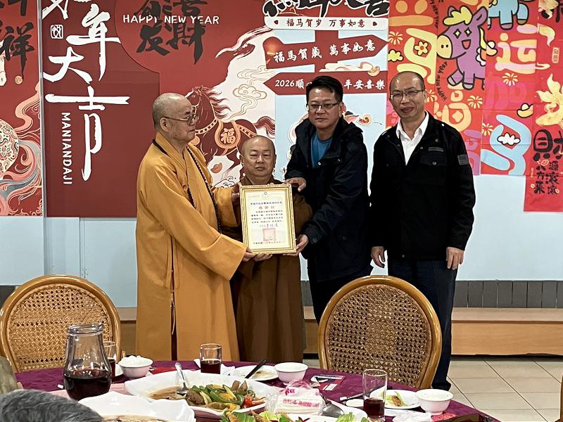 【記者張永漢/高雄報導】高雄市阿蓮區光德寺於115年2月8日11時辦理年終餐會,秉持回饋地方、守護鄉里的精神,慷慨捐贈高雄市政府警察局湖內分局新臺幣10萬元,以提升警用設備,另捐贈阿蓮分駐所巡邏警車一輛,有效提升警方勤務運作機動性。