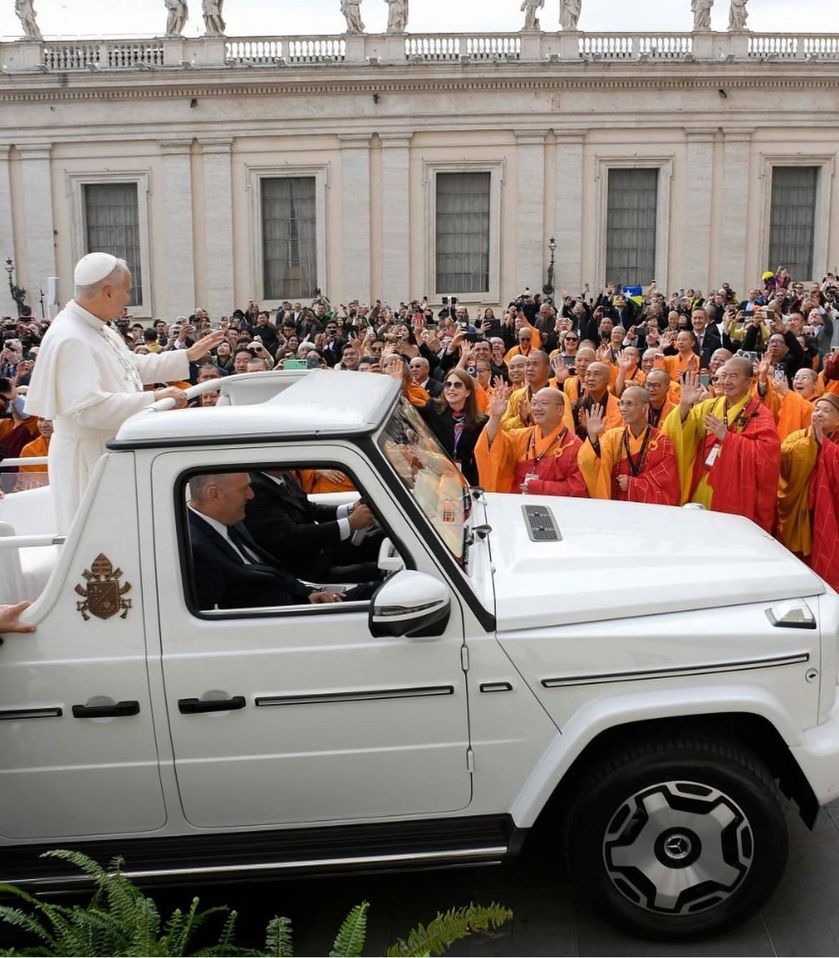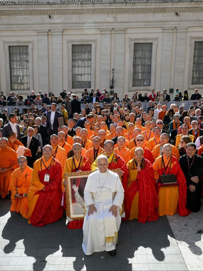 此行由中華人間佛教聯合總會主席團率領,共80人赴會。在歷史性的贈禮儀式上,由佛光山住持心保和尚率領的主席團,致贈教宗三項具深厚意涵的禮物:緬甸育幼院兒童親手製作的教宗寶石畫、一件珍貴的宋朝技藝所製作的聖杯,以及佛光山開山祖師星雲大師的一筆字〈和諧共生,馬到成功〉。
