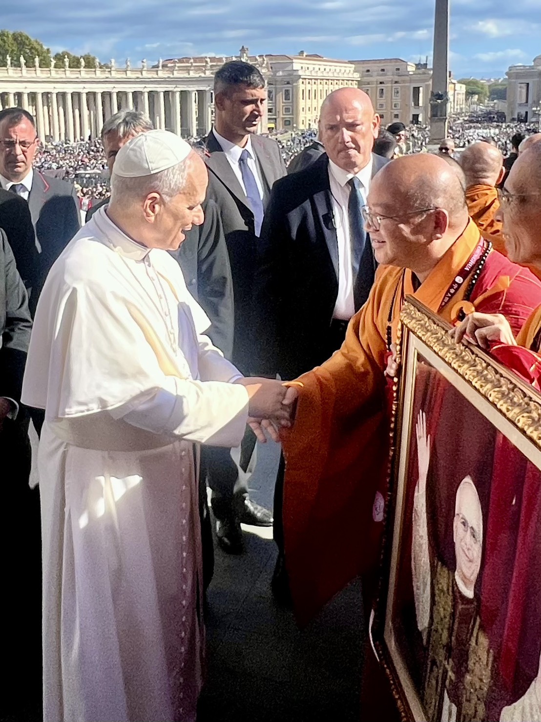 代表團29日在聖伯多祿廣場舉行的十萬人慶典中,與教宗良十四世近距離交流,具體實踐「宗教走出寺廟,走向人間,正式走向世界」的人間佛教理念。