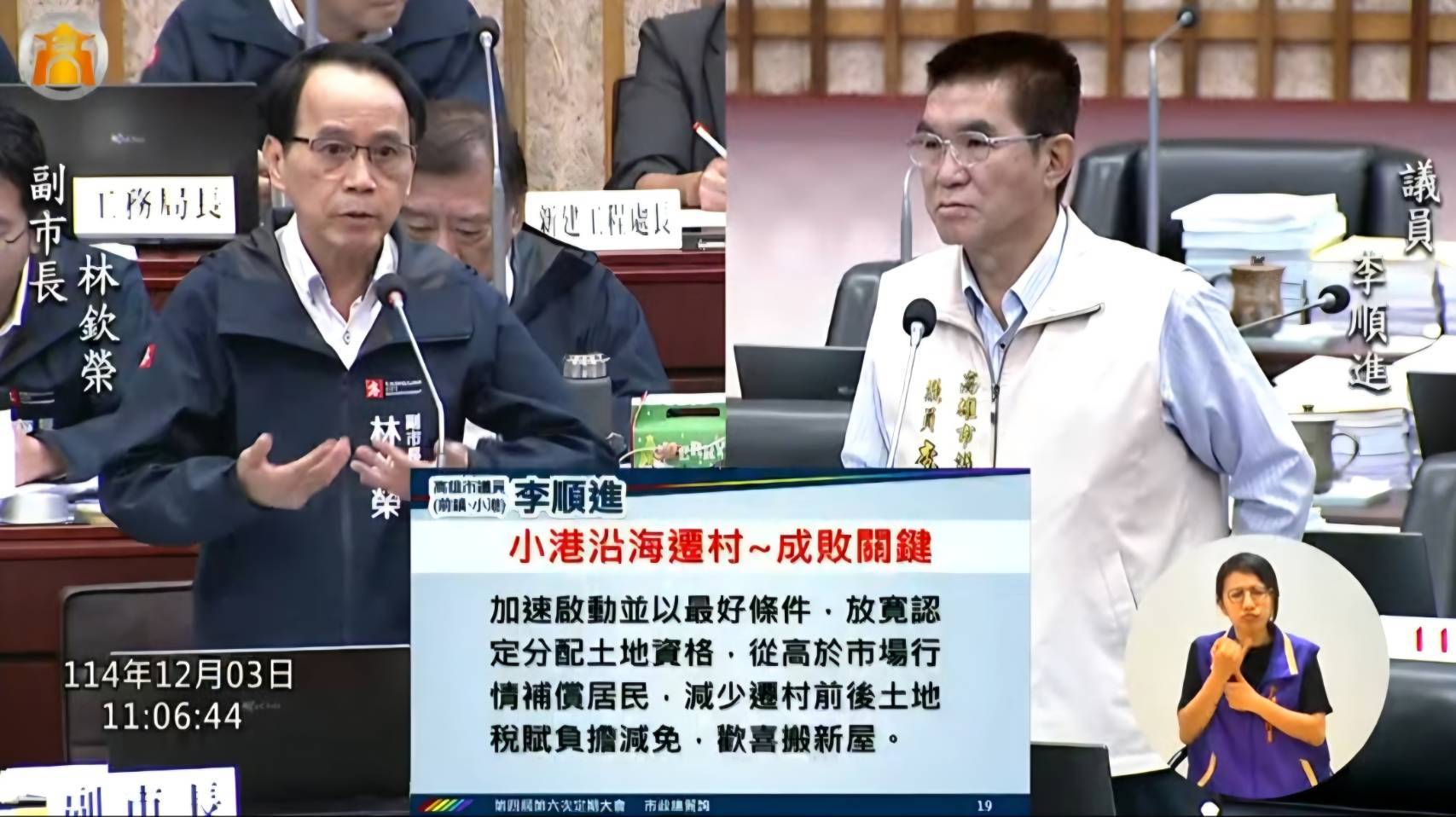 李順進又針對小港沿海遷村案問題指出,大林蒲遷村預定明年啟動土地協議價購說明會,但遷村成敗關鍵在於加速啟動,並以最好條件放寬認定分配土地資格,用高於市場行情補償居民,減少遷村前後土地稅賦負擔;另大廟已在規劃選地中,明年起更要啟動協議價購,固800億遷村經費不夠,應增加至900億或1000億元。副市長林欽榮答覆,遷村經費經市長積極爭取,從500多億增加至800億,包含部分保留準備金,明年元月進行協議價購說明,預定第1季簽訂草約,也會責成各局處加速推動遷村事宜。