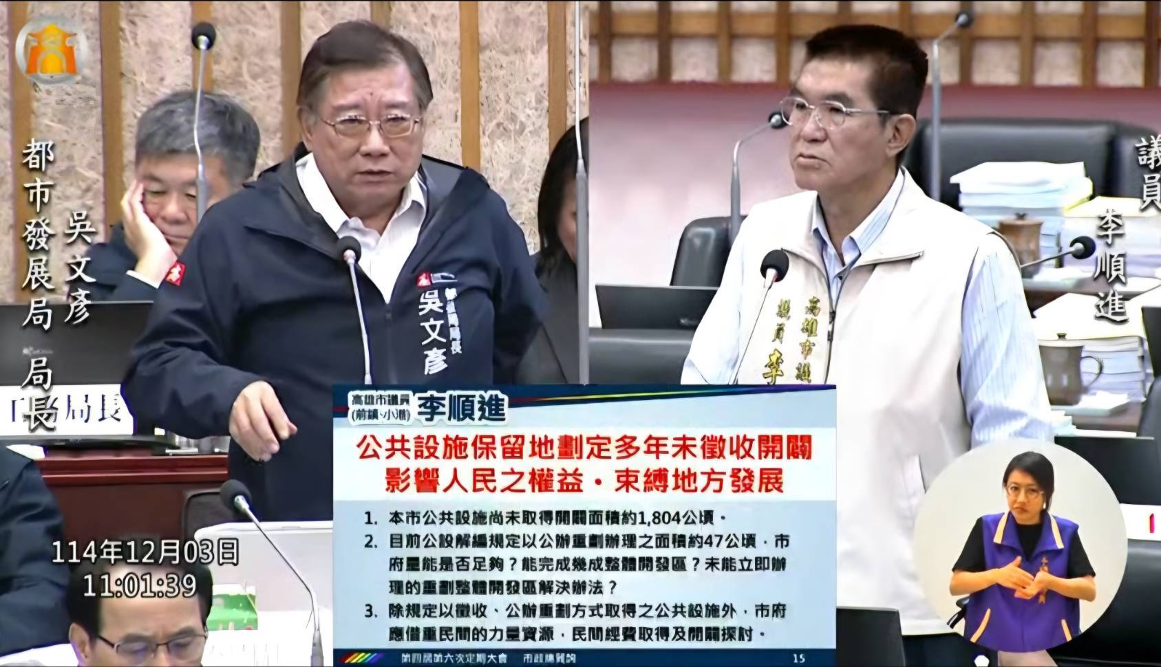 李順進說,高雄市公共設施保留地劃定多年未徵收開闢,目前尚未取得開闢面積約1804公頃,其中公設解編以公辦重劃辦理的面積約47公頃,市府量能是否足夠?未能立即辦理的重劃整體開發區解決辦法為何?另區段徵收、公私辦市地重劃的公益性、必要性、迫切性等束縛著城市地方發展,市府應以徵收、公辦重劃方式取得公共設施,或借重民間資源開闢。都市發展局長吳文彥回答,要視急迫性、公益性等狀況處理。