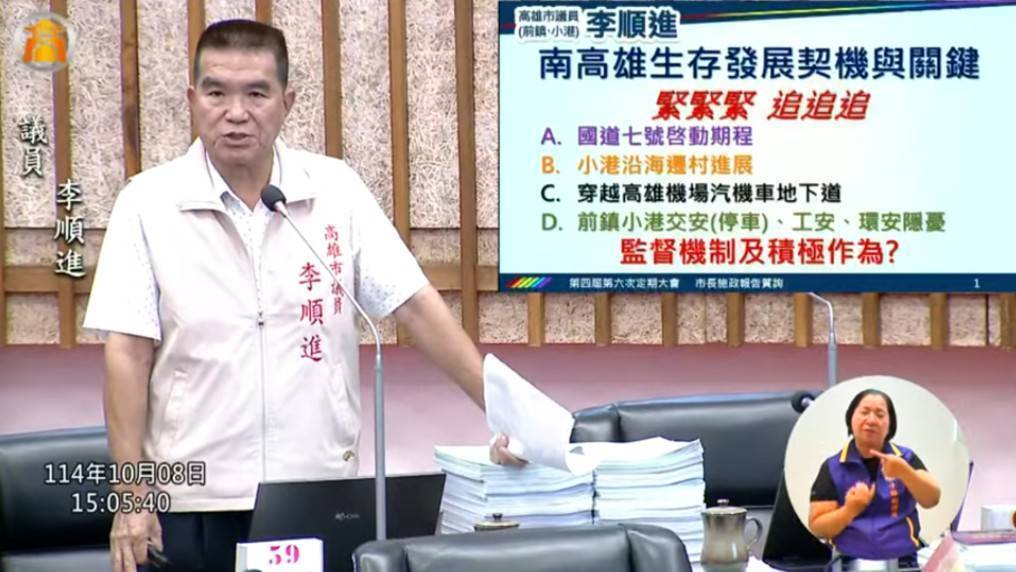 【記者吳鳯戀/高雄報導】高雄市議員李順進於8日市長施政質詢中,針對南高雄經濟發展契機與關鍵問題,關切國道7號施工期程、小港沿海遷村、前鎮及小港交安、公園建蓋地下停車場、興建穿越機場地下道等議題,除提出建言,並要求市府團隊盡速研議解決問題。