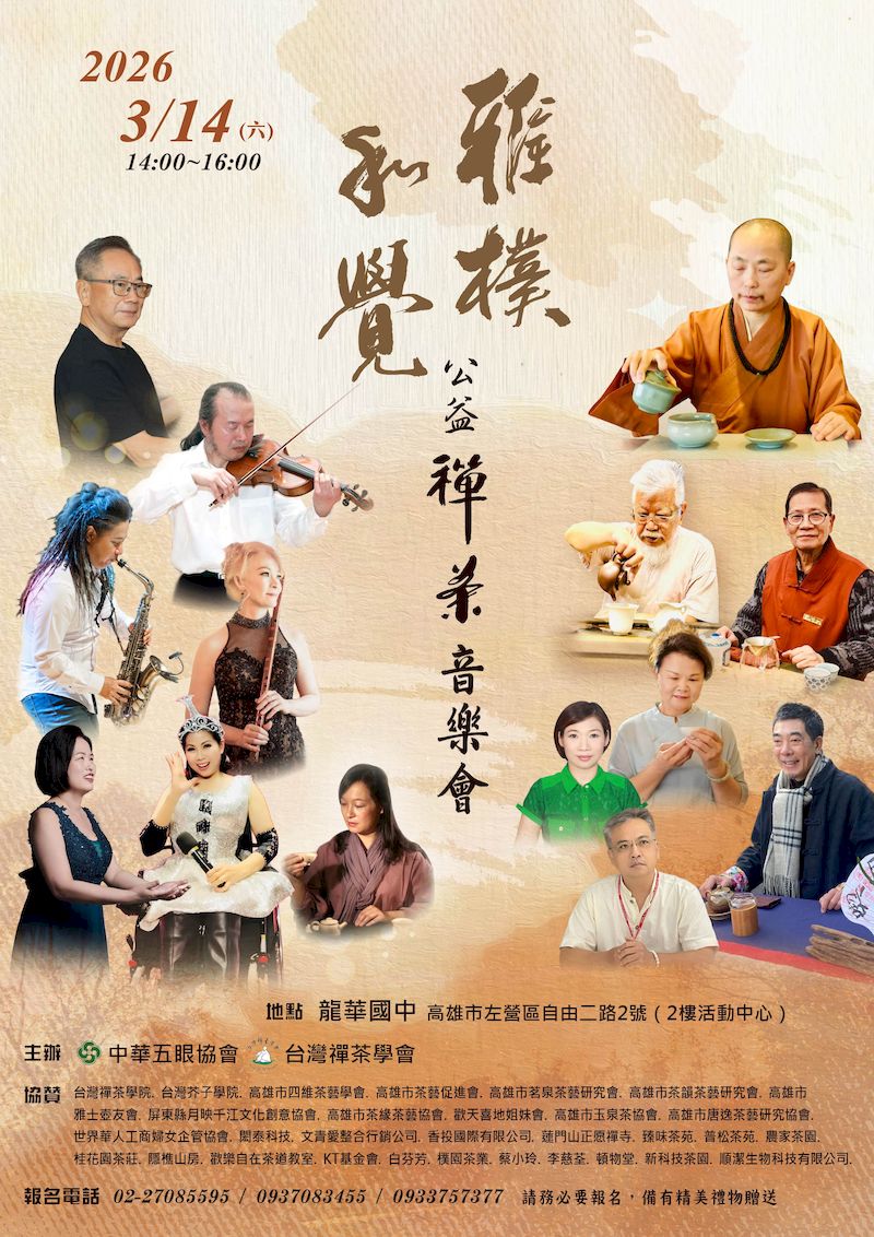 【記者張永漢/高雄報導】由中華五眼協會與台灣禪茶協會聯合主辦的「雅樸和覺-公益禪茶音樂會」,日前於高雄市龍華國中活動中心隆重舉行,匯聚來自全台各地逾600位文化界、教育界、藝文界與公益團體人士齊聚一堂,在音樂、禪修與茶道交融之中,共同體驗一場兼具精神深度與文化高度的心靈盛會。