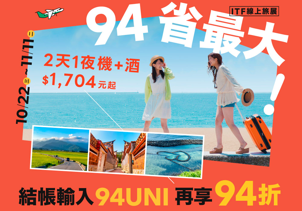 國內機加酒領導品牌「立榮假期」3天2夜機加酒$3,154元起,結帳輸入折扣碼「UNI94」再享94折,現場還能參與低價競標機加酒;「長榮假期」國外機加酒輸入折扣碼「ALL600」,最高現折$2,600,指定航線送esim,下單還能抽機票,於旅展現場完成訂購再贈長榮航空精美周邊,數量有限送完為止。