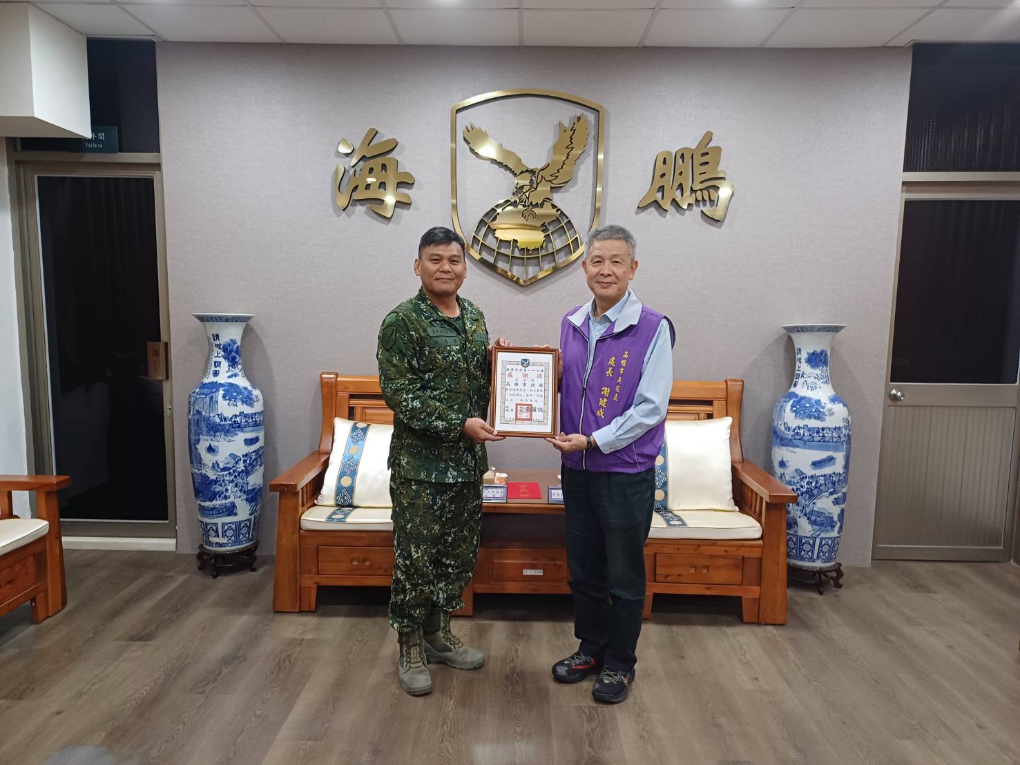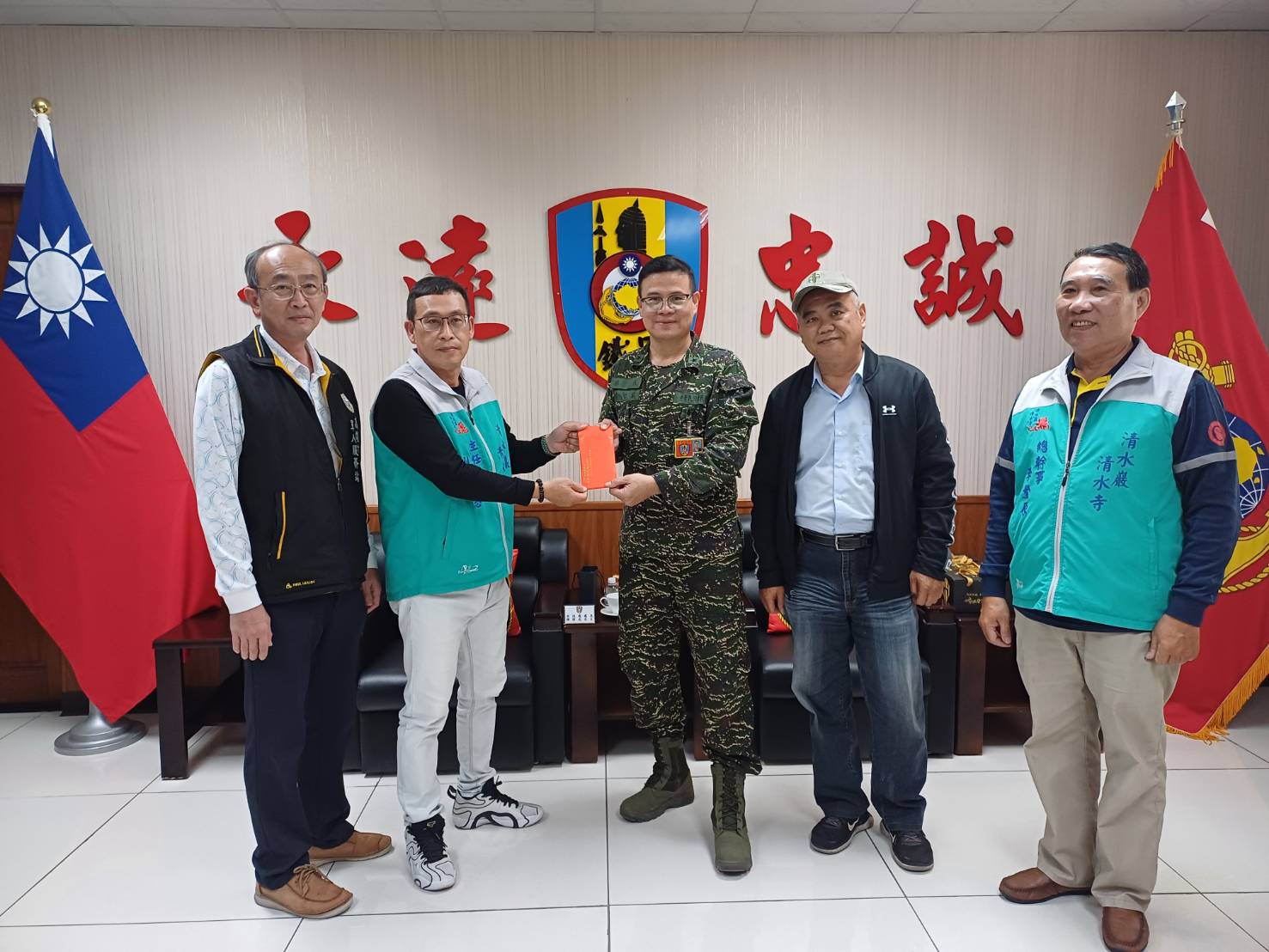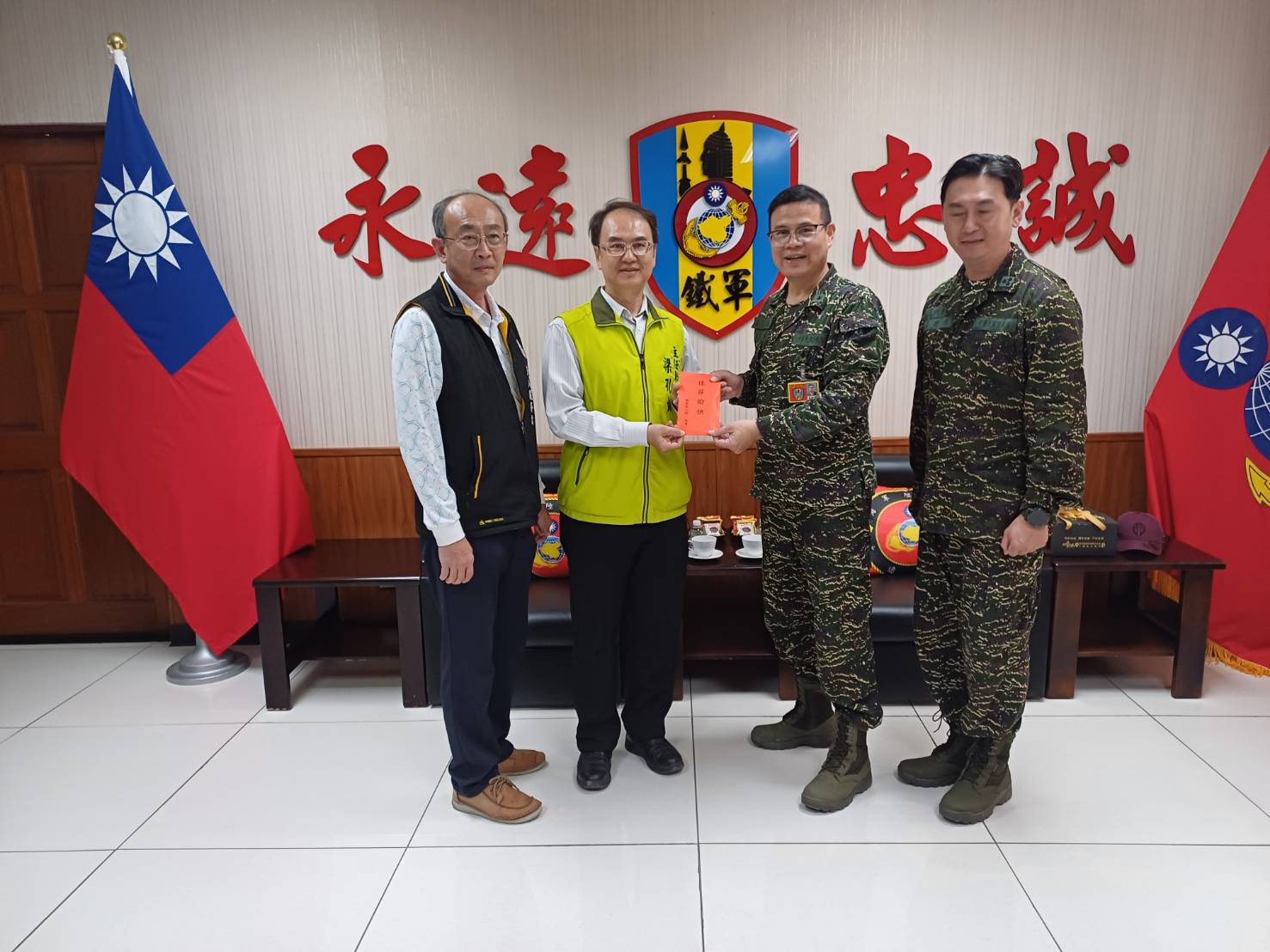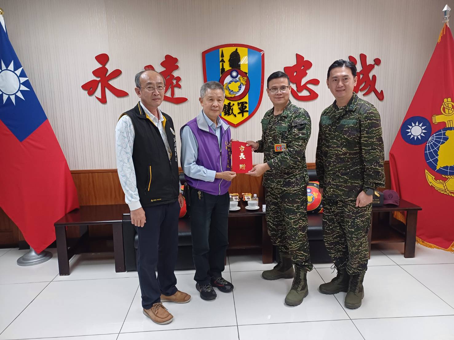 【記者張永漢/高雄報導】為向勞苦功高的國軍官兵表達春節祝福,高雄市政府今(4)日上午由兵役處處長謝健成前往陸軍步兵訓練指揮部及陸軍步兵117旅慰勞官兵;下午則由林園區代理區長梁孔成、清水巖清水寺主委劉建德,在高雄市軍人服務站幹事陳柏夆陪同下,前往海軍陸戰隊陸戰99旅,代表市長向駐軍部隊致意,肯定國軍弟兄姐妹在國防任務上的努力與付出,受到各單位主官及幹部熱烈歡迎。