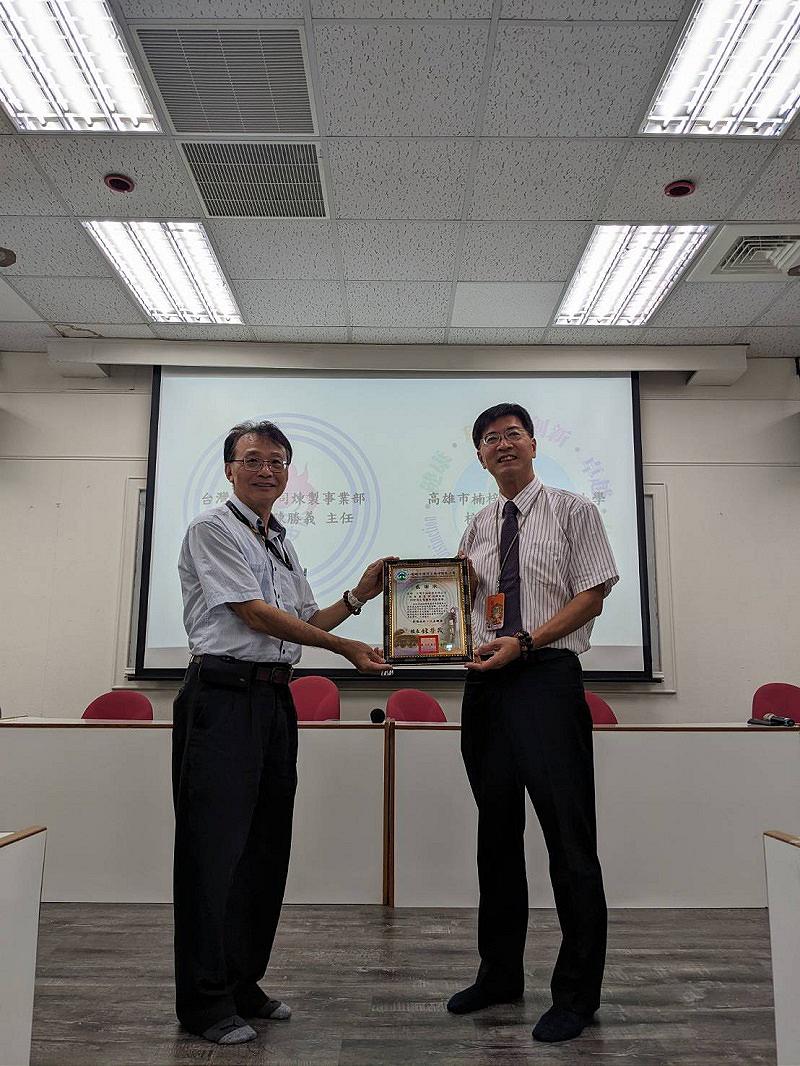 圖說:楠梓國小鍾榮茂校長(圖右)頒發感謝狀予中油公司煉製事業部,由資訊室陳勝義主任(圖左)代表接受。