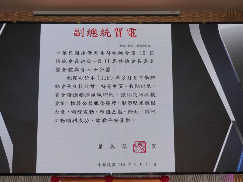 副總統蕭美琴亦致賀電表示:「長期以來,貴會積極發揮組織綜效,強化災防救援量能,推展公益服務廣度,殊值嘉勉。」