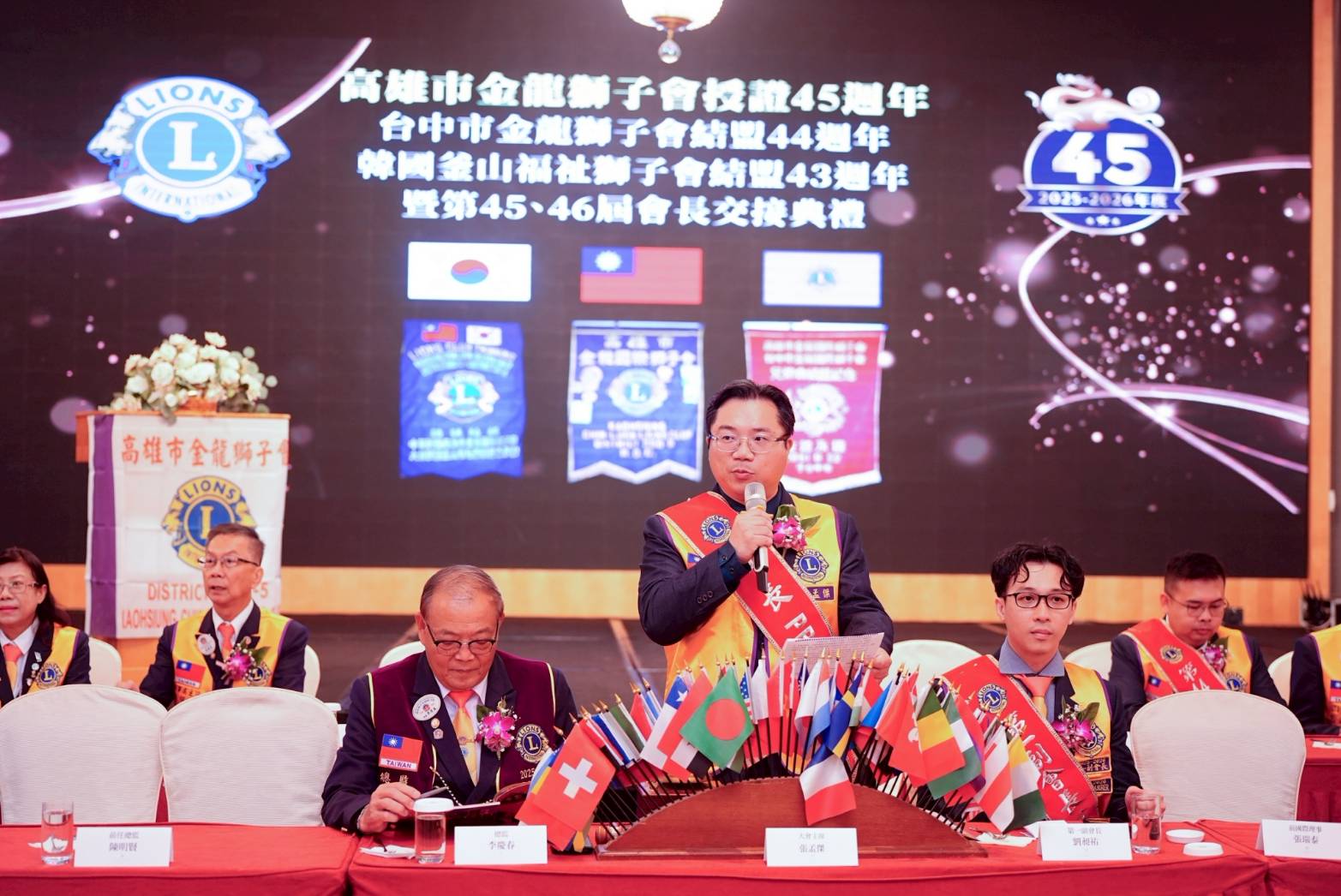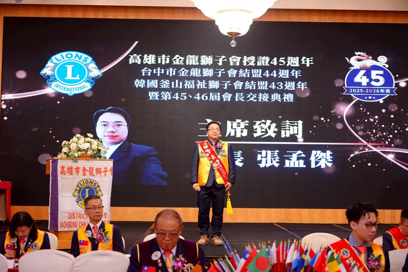 【記者張永漢/高雄報導】高雄市金龍獅子會於115年4月9日,假高雄漢來飯店隆重舉行第45屆授證典禮,象徵年度會務圓滿完成,同時為新一屆揭開嶄新序幕。典禮現場冠蓋雲集,政商名流與各界獅友齊聚一堂,共同見證會長張孟傑接受國際獅子會授證的重要時刻,氣氛莊重而熱烈。