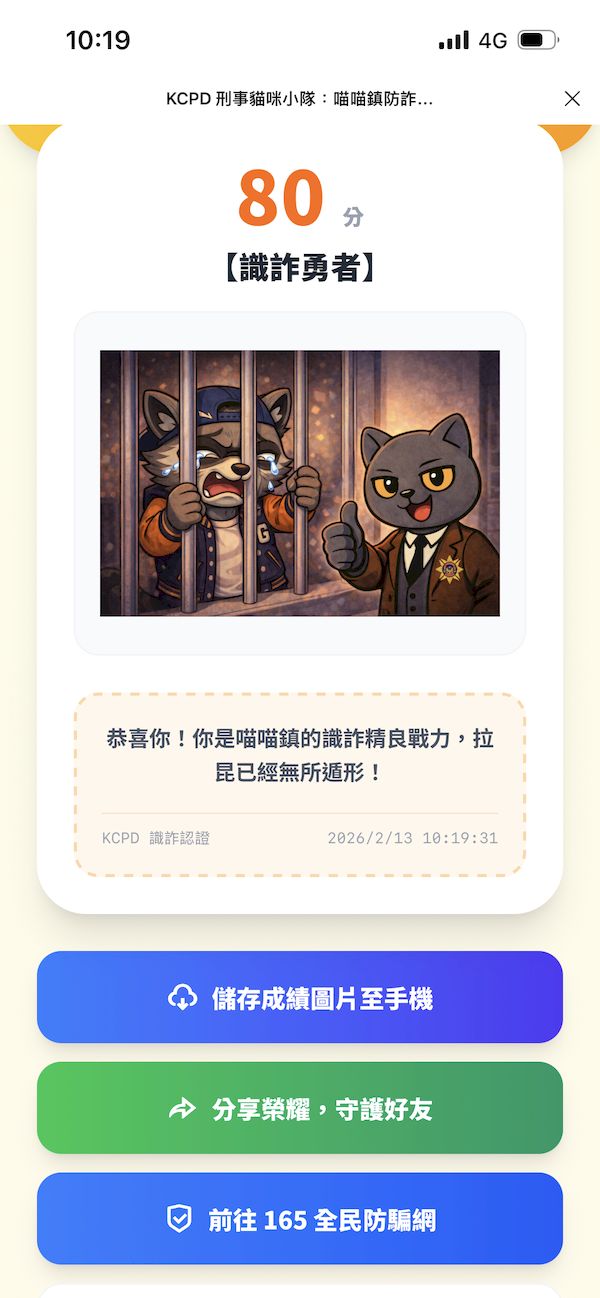 每題僅提供兩個選項,簡單易懂,適合親子共玩、學生體驗與民眾自我檢測。完成測驗 還能獲得專屬識詐稱號,期待透過分級回饋機制,讓參與者了解自身識詐能力,並持續強化防詐意識。