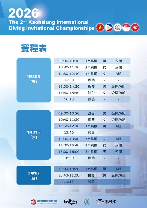 【記者張永漢/高雄報導】為促進國際跳水運動交流、提升台灣跳水競技水準,「2026第二屆高雄跳水國際邀請賽」將於1月29日至2月1日於高雄市盛大舉行。