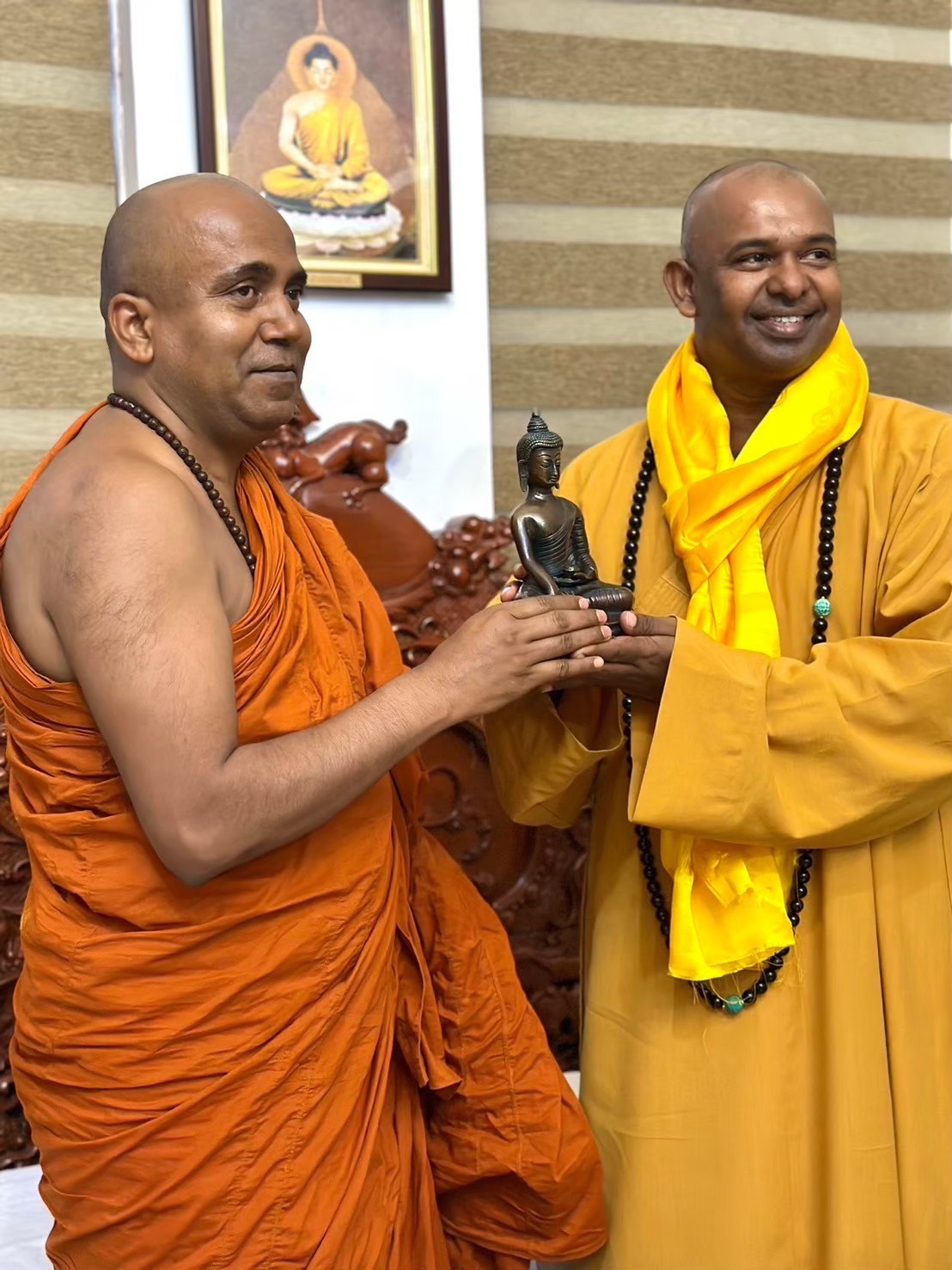 ▲圖說:天崧法師(右)與 Venerable Dr. Manoj Thero(左)於印度菩提迦耶交流互贈佛像,展現跨宗派法誼與融合精神。