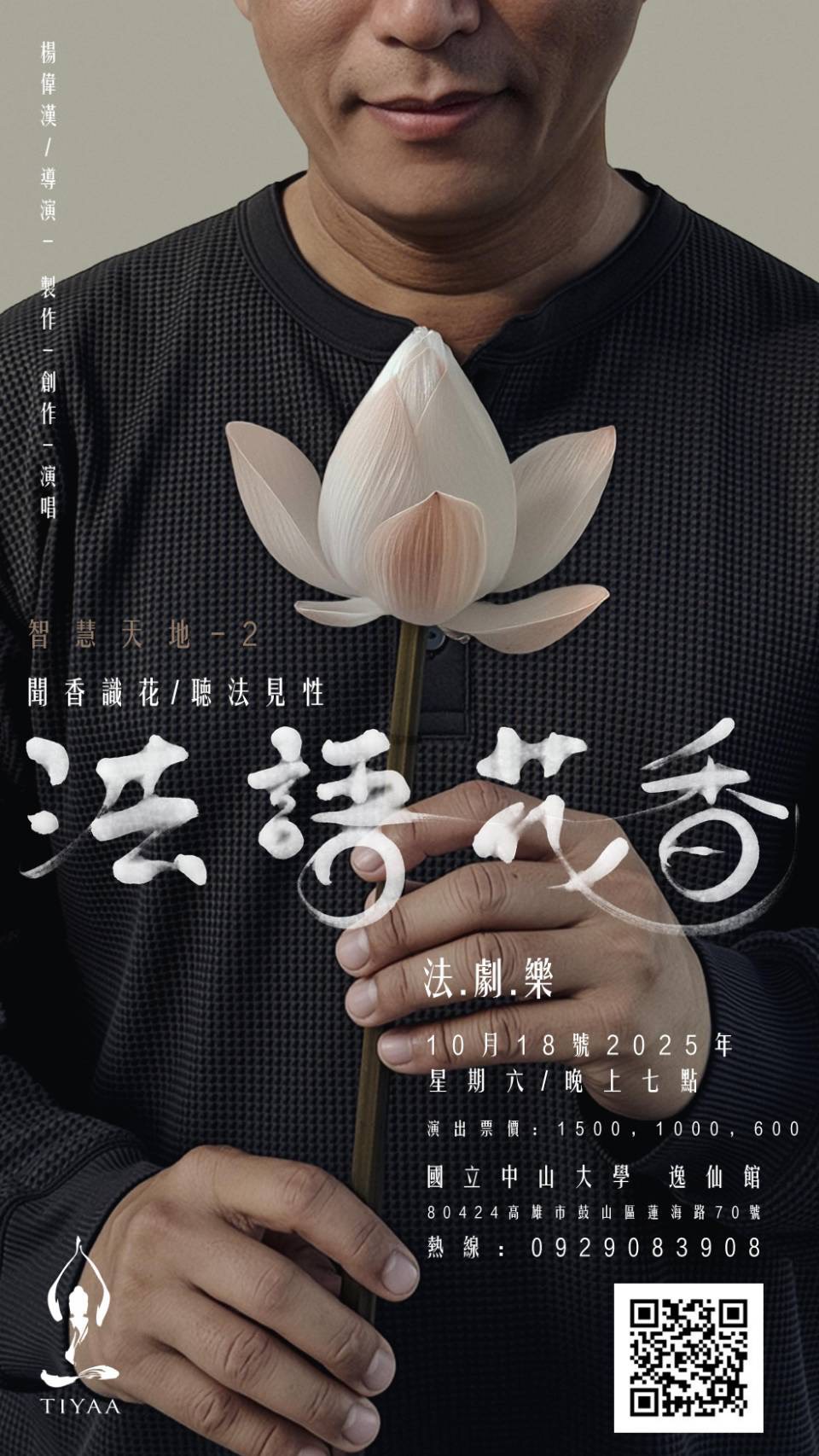 由天崧法師監製、楊偉漢導演策劃的心靈法劇樂——「法語花香」,將於 10 月 18 日(六)晚間 7 點,在國立中山大學逸仙館隆重演出。