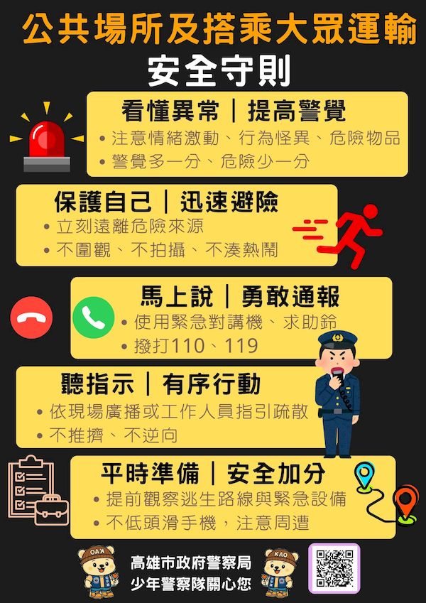 【記者張永漢/高雄報導】因應近日臺北市捷運站、百貨公司等公共場所發生隨機殺人等重大公共安全事件,引發社會高度關注,高雄市政府警察局少年警察隊秉持「預防重於事後處理」原則及因應社會脈動,連夜趕工自製「公共場所及搭乘大眾運輸安全守則」宣導梗圖海報,提醒學生及民眾於公共及大型活動場所、搭乘大眾運輸工具時,提高警覺、強化自我保護與安維應變意識。