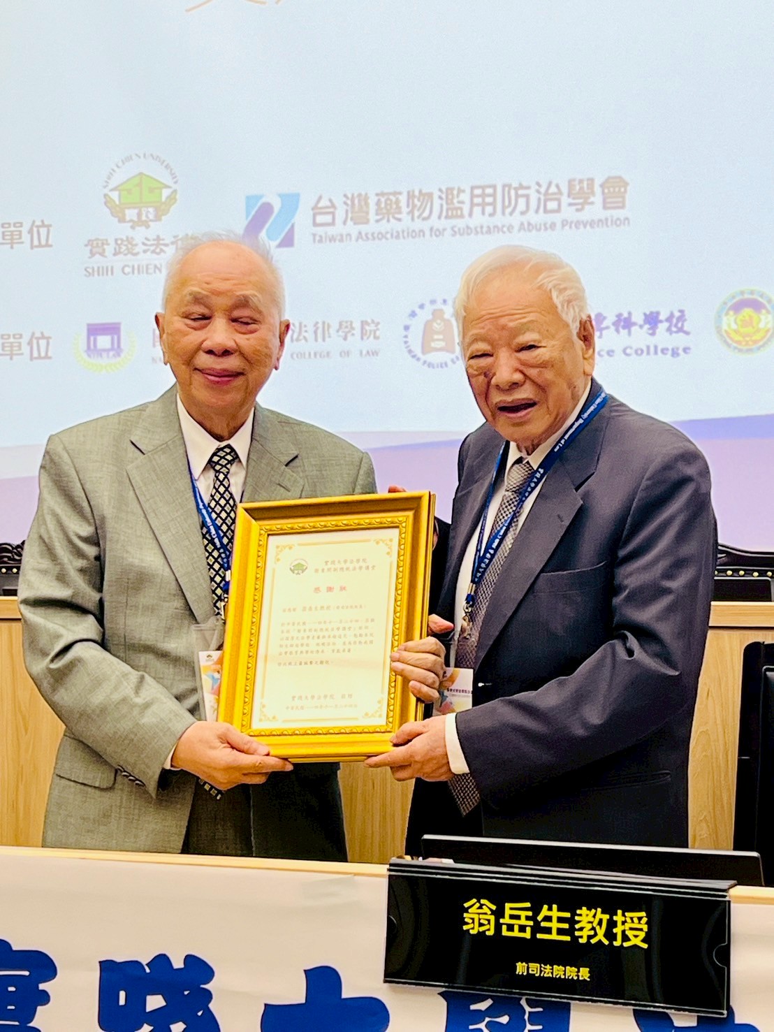 ▲圖/謝孟雄董事長感念前司法院院長翁岳生教授長年作育英才,並親自臨本次研討會提攜後進,特致贈感謝狀以表謝忱。