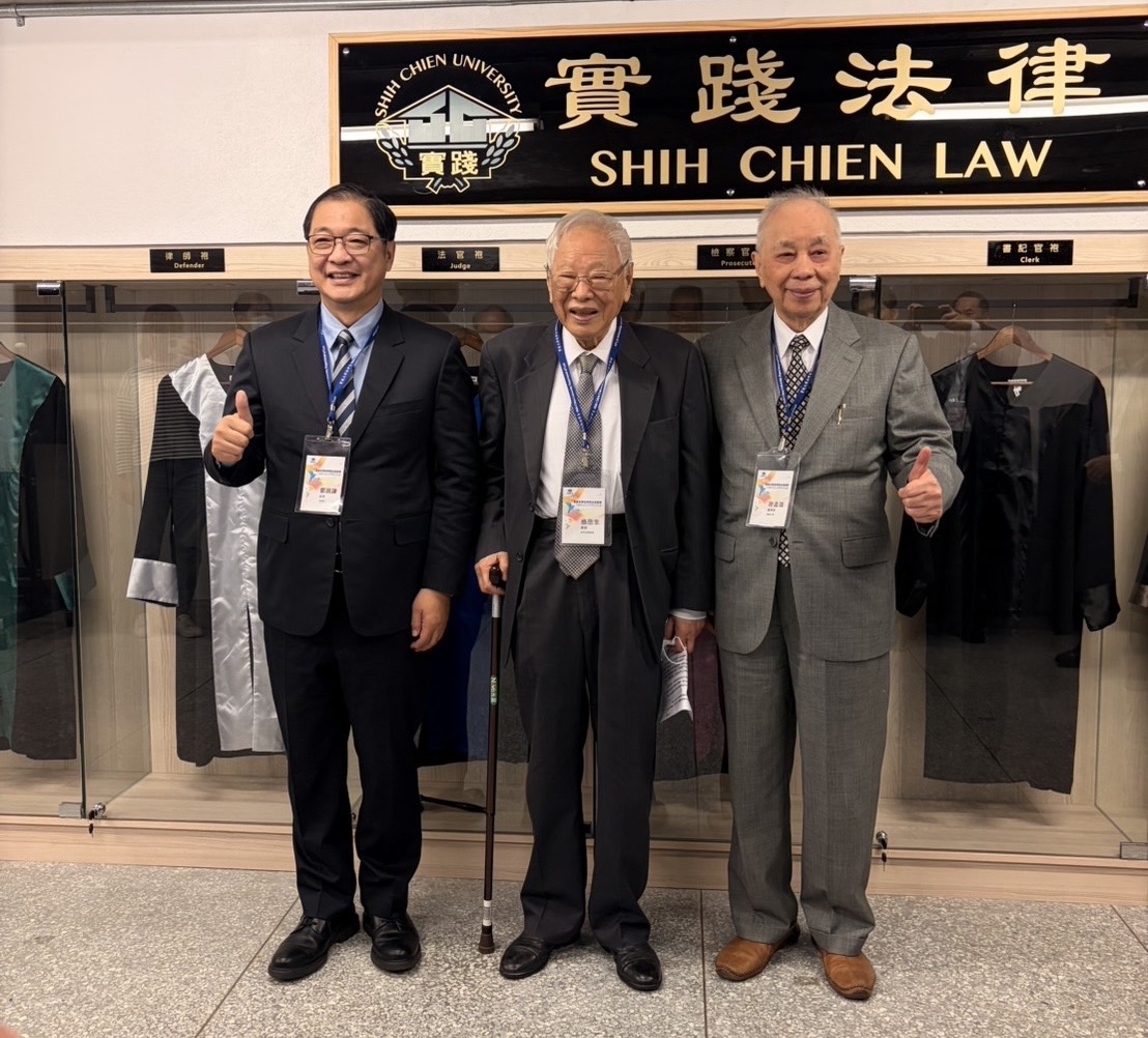 ▲圖:(自右起)法務部鄭銘謙部長、前司法院院長翁岳生教授、實踐大學謝孟雄董事長會中於實踐大學法學院實習法庭合影。