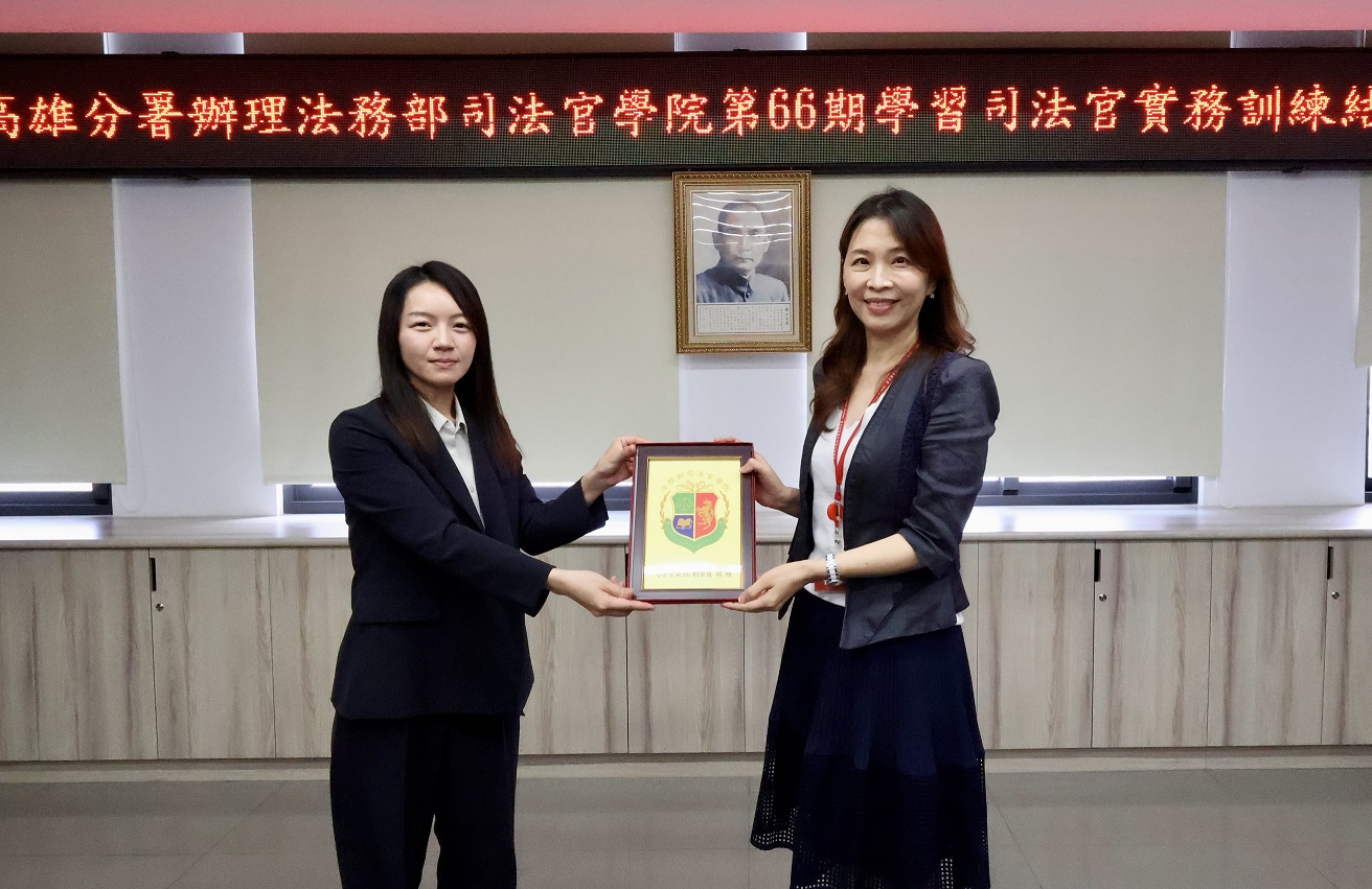 楊分署長感性期勉學員,司法官除了法律的專業外,要隨時保持好奇心,打開視野去學習與探索各領域的知識與常識,並培養對人性與世界的瞭解,轉換成偵查與審理案件的能力與洞察力;相信每一位學員將來都能成為一位優秀的司法官,促進臺灣的法治與公平正義永續發展。座談會後學院致贈感謝狀,指導執行官也致贈紀念品予準司法官,在師生離情依依的珍重聲中,高雄分署舉辦的第66期學習司法官實務學習劃下圓滿句點。