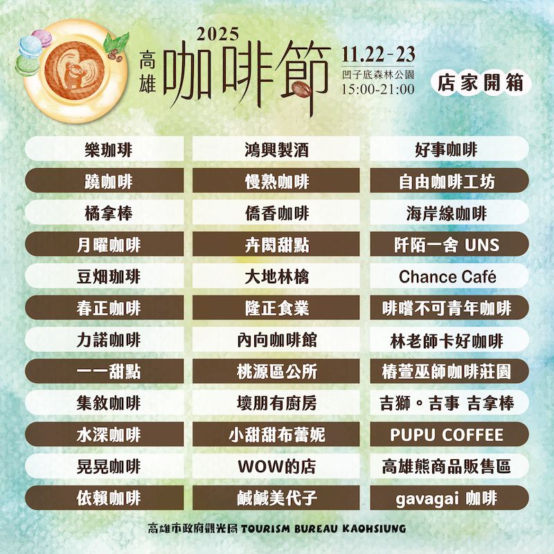 【記者楊賢明/高雄報導】微涼初冬,最適合來杯暖心咖啡!高雄市政府觀光局以「咖啡」為主題,將於11月22日、23日在凹子底公園,盛大舉辦「2025高雄咖啡節」,邀請海內外旅客感受高雄的生活風景與美食魅力。