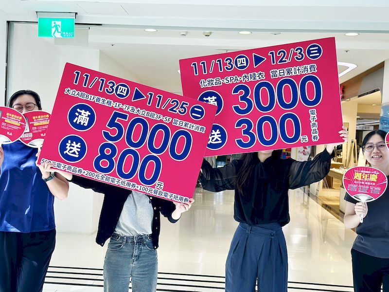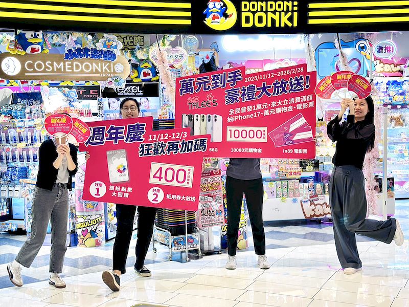 響應政府全民普發一萬元政策,大立同步推出「萬元到手・好禮大放送」活動,即日起至明年2月底,在大立當日消費滿1萬元以上即可參加抽獎,有機會將iPhone 17、萬元購物金及電影票等多項好禮帶回家。活動月月開獎,讓消費者在普發喜悅中享受加倍驚喜。週年慶期間,大立再祭出「繽紛點數大回饋」活動,指定專櫃單日消費滿1萬元以上即可獲得繽紛點數1,000點,MUJI無印良品、TSUTAYA BOOKSTORE、客美多咖啡、2nd Street等品牌及餐廳皆參與本次活動,回饋豐富、好康不間斷。