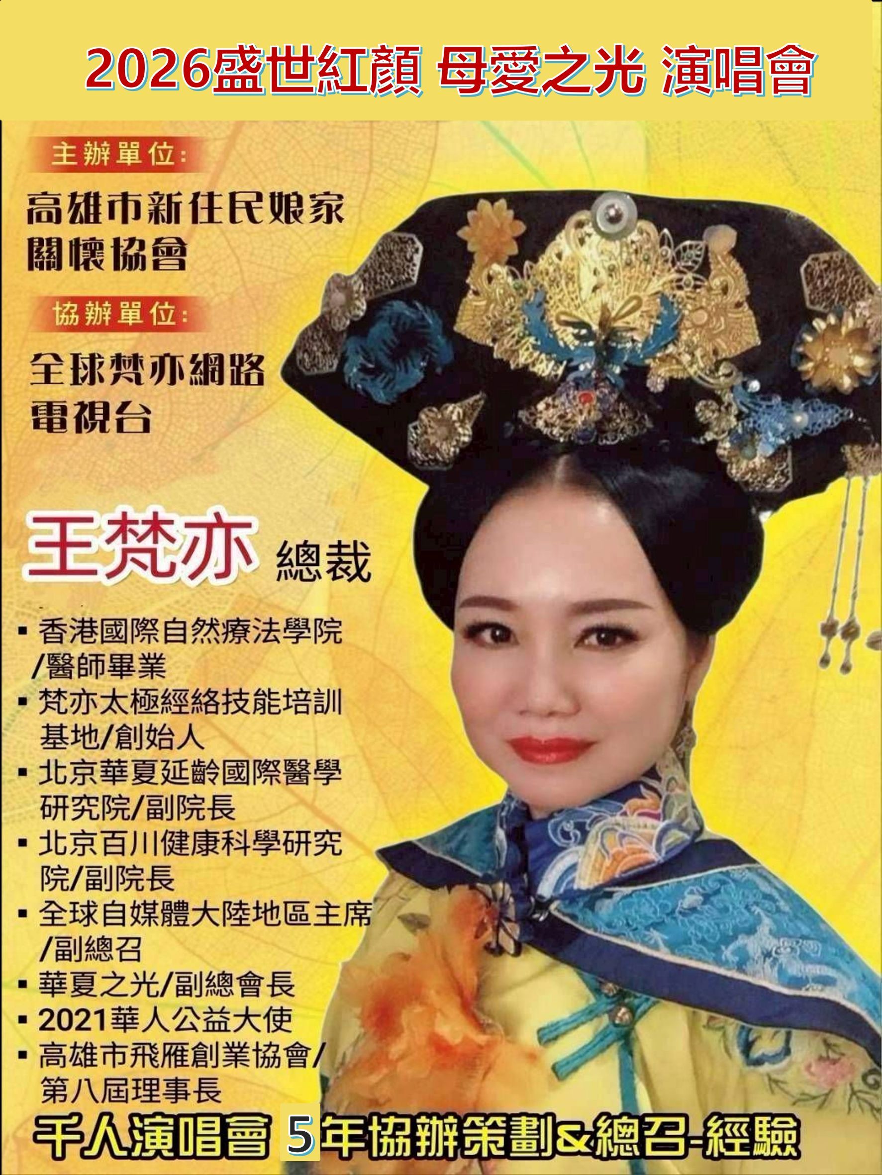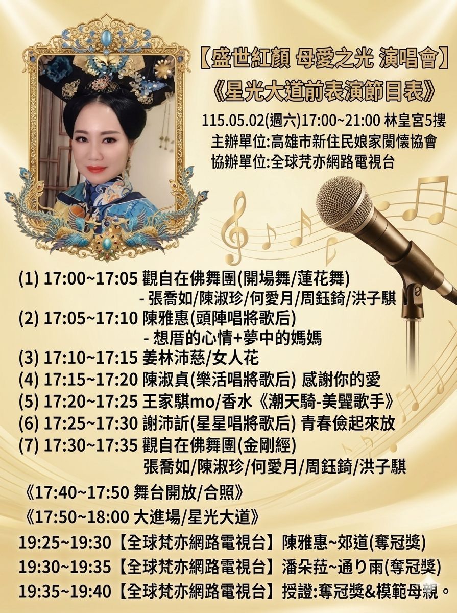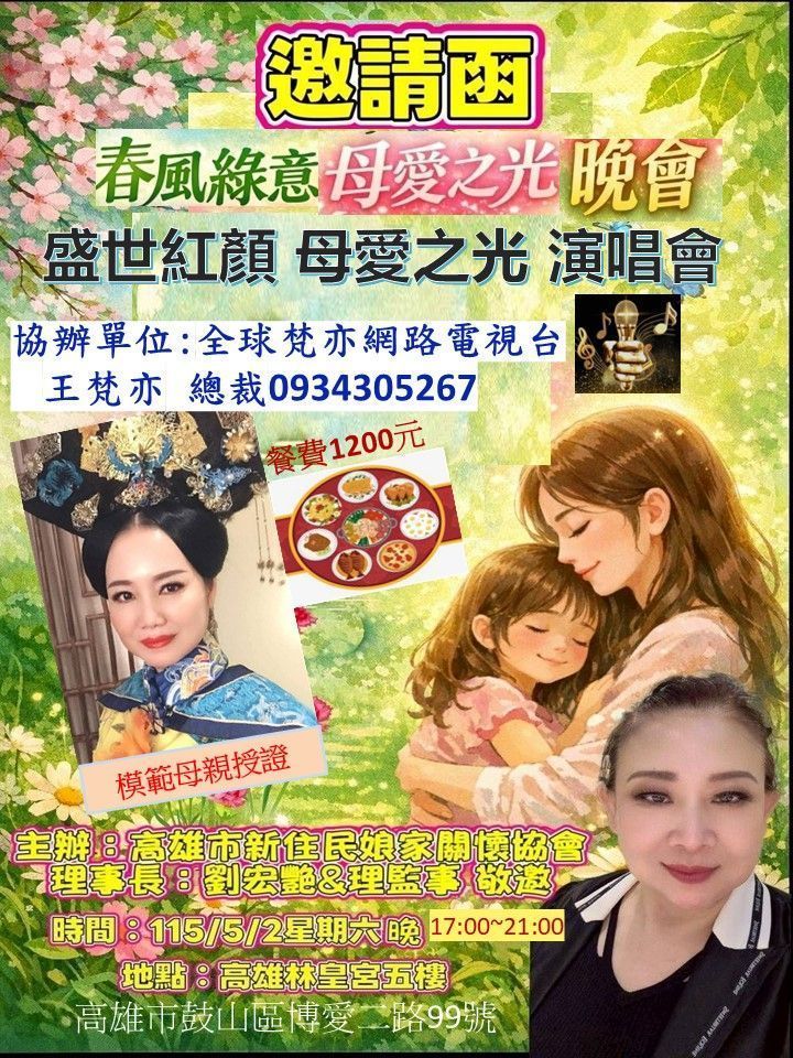 【記者王梵亦/高雄報導】隨著五月溫馨母親節腳步將近,由高雄市新住民娘家關懷協會主辦的「盛世紅顏・母愛之光」演唱會,將於5月2日(星期六)下午5時,在高雄林皇宮五樓盛大舉行。