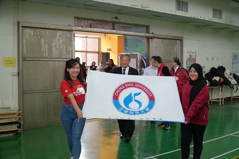 活動在充滿活力的「Team Taiwan暖身操」中熱鬧揭幕,龔瑞璋校長率領多位師長一同上場帶動氣氛,現場歡笑聲不斷。隨後由校長頒發象徵祝福的平安符給予同學,為活動揭開序幕,接著展開三項結合趣味性與團隊默契的競賽。首先登場的「馬上抱緊」,考驗參賽同學在逐漸縮小的紙張上維持站立平衡,象徵同舟共濟、緊密團結的合作精神。