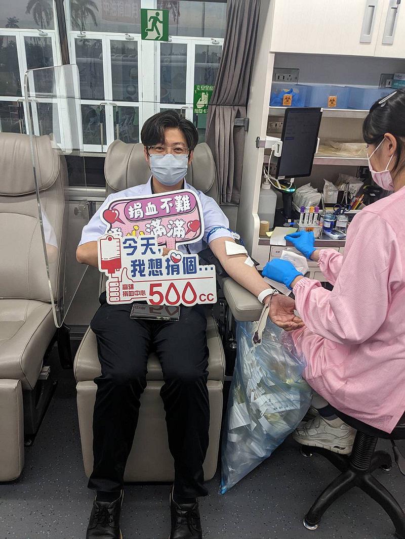 圖說:中油公司南部採購中心顏豪主任挽袖捐血。