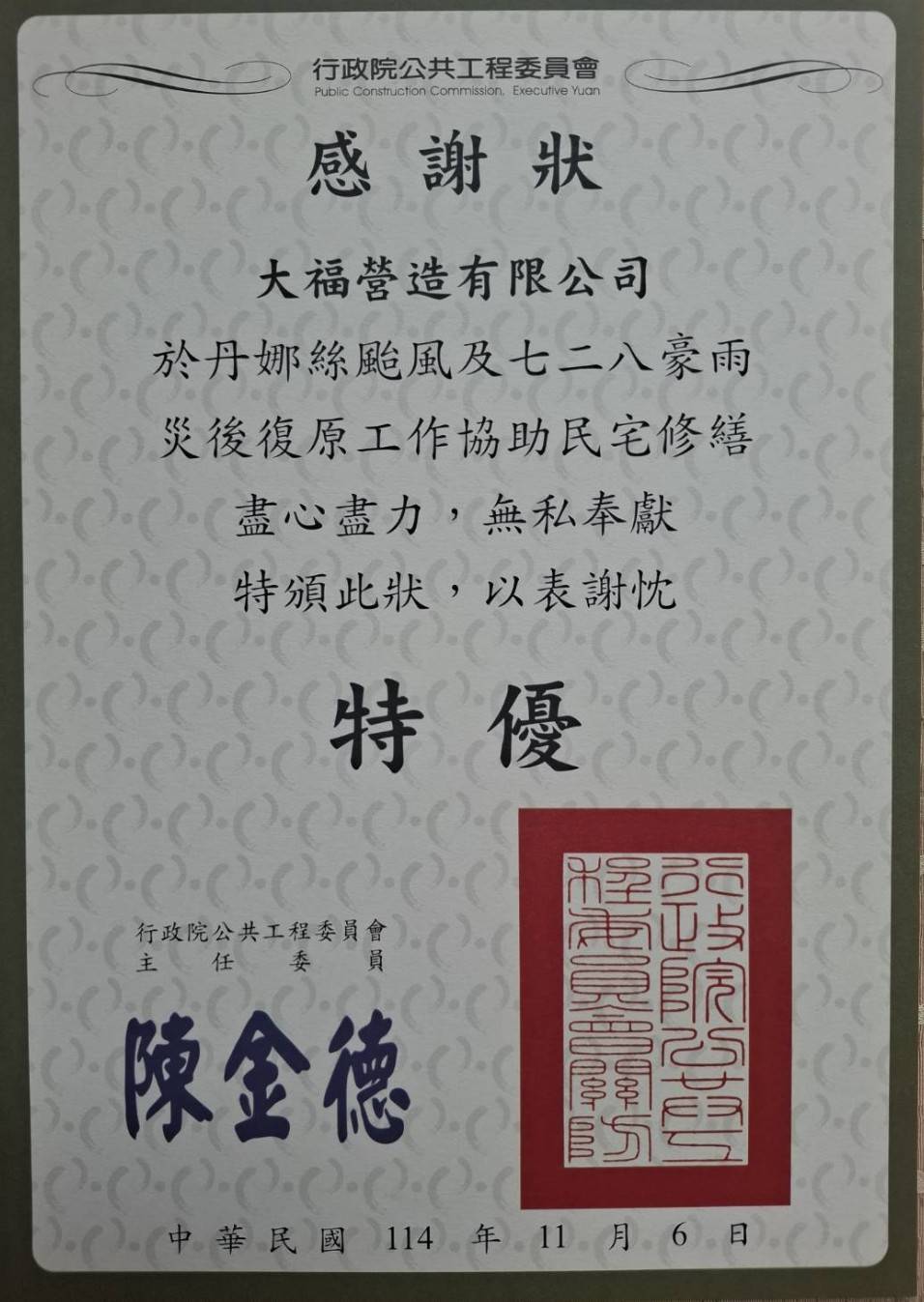 其中,由愛台灣獅子會與大福營造公司共同組成的「丹娜絲風災重建團隊」,協助受災戶以成本價完成40戶屋頂重建工程,表現卓越,榮獲全國第六名「特優團隊」殊榮。