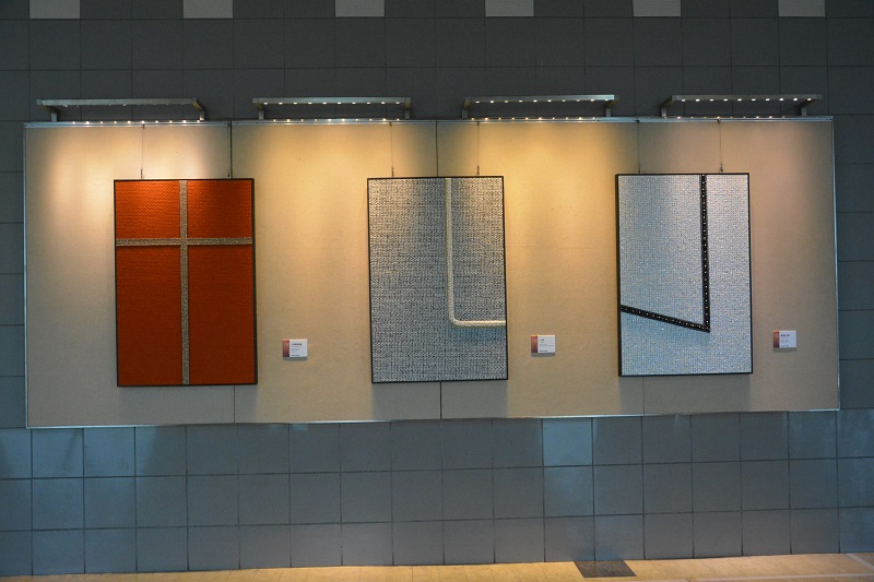 在創作手法上,朱老師巧妙運用花呢布料、鈕扣、飾帶、手工抽紗等多樣織材,透過層層堆疊、拼貼與縫製的技法,將纖維材料轉化為兼具視覺衝擊與語言隱喻的藝術作品。她以高訂服裝的嚴謹態度處理每一個細節,刻意營造不對稱與開放式結構,讓原本屬於服飾的形式,轉化為可懸掛於牆上的當代藝術品。