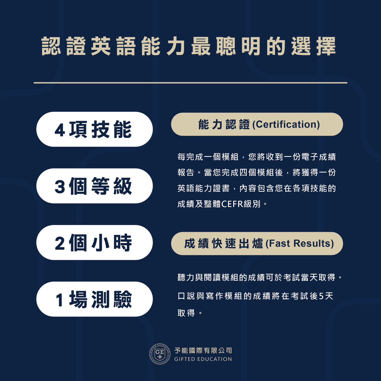 這些測驗價格合理、全線上自適性運作,並能快速產出四項技能的成績。應試者可一次測全部技能,或選擇性報考任意組合。全程個人化、具激勵性、低壓力,協助考生展現最佳能力、開啟更多機會之門。