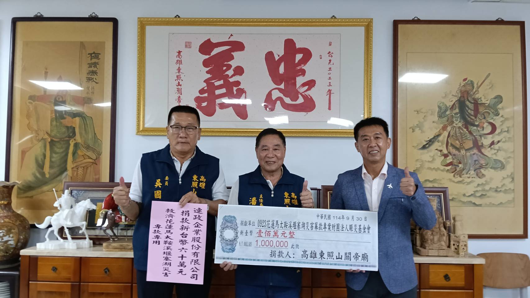 【記者李祖東/高雄報導】受強颱「樺加沙」帶來的豪雨侵襲,花蓮光復鄉馬太鞍溪堰塞湖溢流釀成慘重災情,造成18人罹難、6人失聯、157人受傷。全國各地救援人員與物資持續湧入之際,南台灣知名信仰中心—高雄大樹東照山關帝廟管理委員會與信徒也不缺席公益行動,不僅自主組團前往花蓮化身鏟子超人,更經過委員會決議,援助新臺幣100萬元協助救災,展現關聖帝君「義薄雲天」的精神。