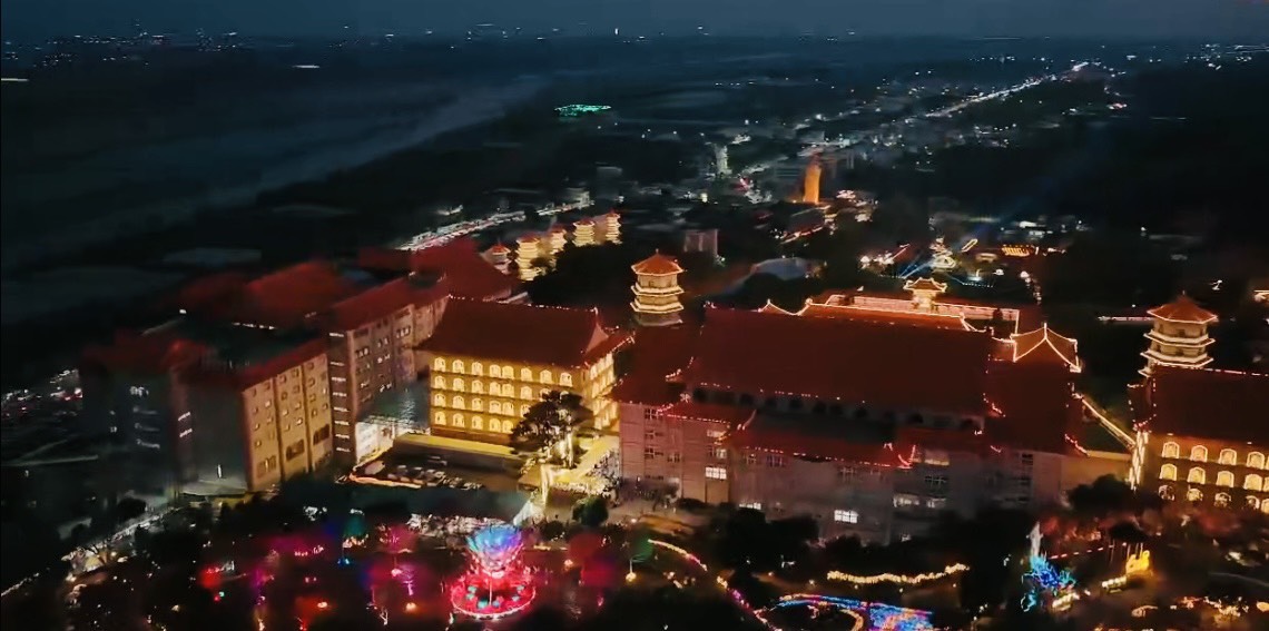 鏡頭俯瞰佛光山與佛陀紀念館園區,展現融合宗教藝術、歷史文化與公共教育功能的文化地標格局。