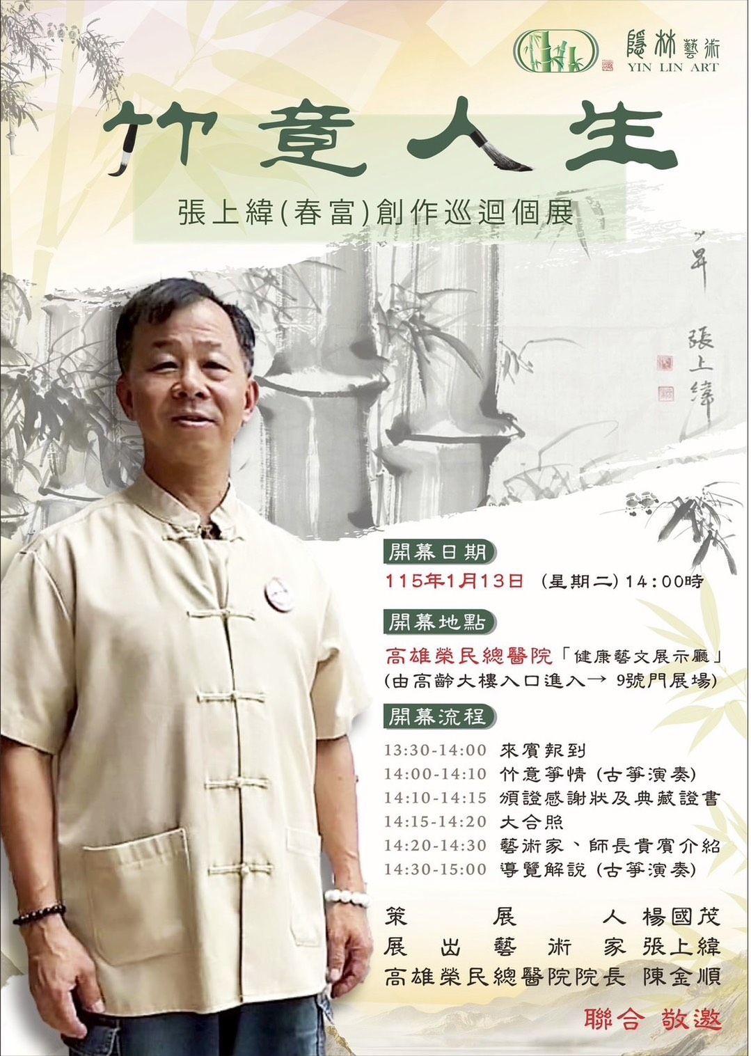 【記者張永漢/高雄報導】傳統水墨國畫走入醫療空間,讓藝術成為撫慰人心的力量。高雄榮民總醫院迎接 2026 年,推出開春首檔藝文展覽——《竹意人生》創作巡迴個展,邀請長年以「竹」為創作核心的水墨藝術家張上緯(春富)老師策展展出,透過墨竹書寫生命哲學,為醫療場域注入溫潤而堅韌的藝術能量。