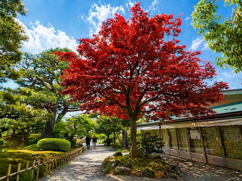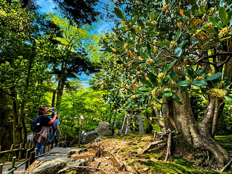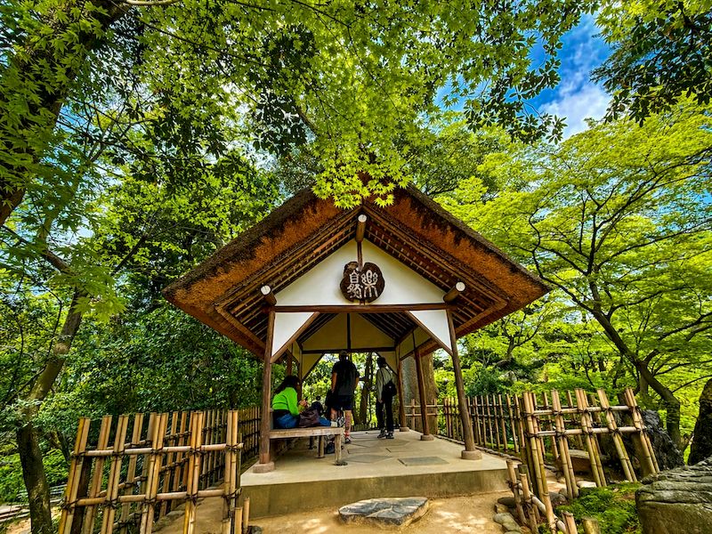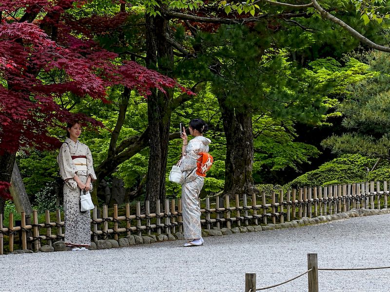 漫步於園內,氣候溫潤宜人,微風輕拂,此時也是體驗和服文化的最佳時機,不少遊客換上典雅和服,穿梭於松樹、曲水與茶屋之間,舉手投足皆成風景。