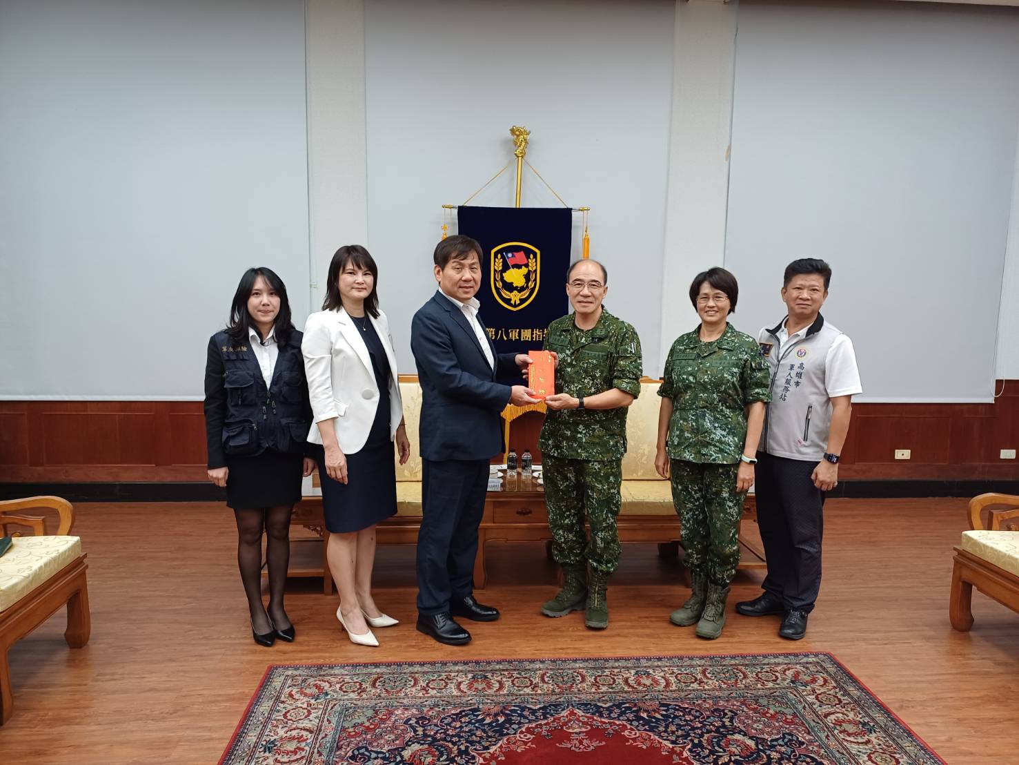 【記者張永漢/高雄報導】軍友保險代理人股份有限公司為感念國軍官兵在保國衛民上的辛勞與付出,今(23)日上午由董事長郭建忠率領總經理黃秀芬、總顧問歐復興,以及國軍急難慰助慈善協會理事長黃開森等人,在高雄市軍人服務站站長吳俊一及幹事陳柏夆陪同下,前往陸軍第八軍團指揮部、空軍航空技術學院、海軍艦隊指揮部、海軍陸戰隊指揮部及新兵訓練中心實施敬軍慰勞,代表事業體向全體官兵致敬,並提前祝賀中秋佳節快樂。