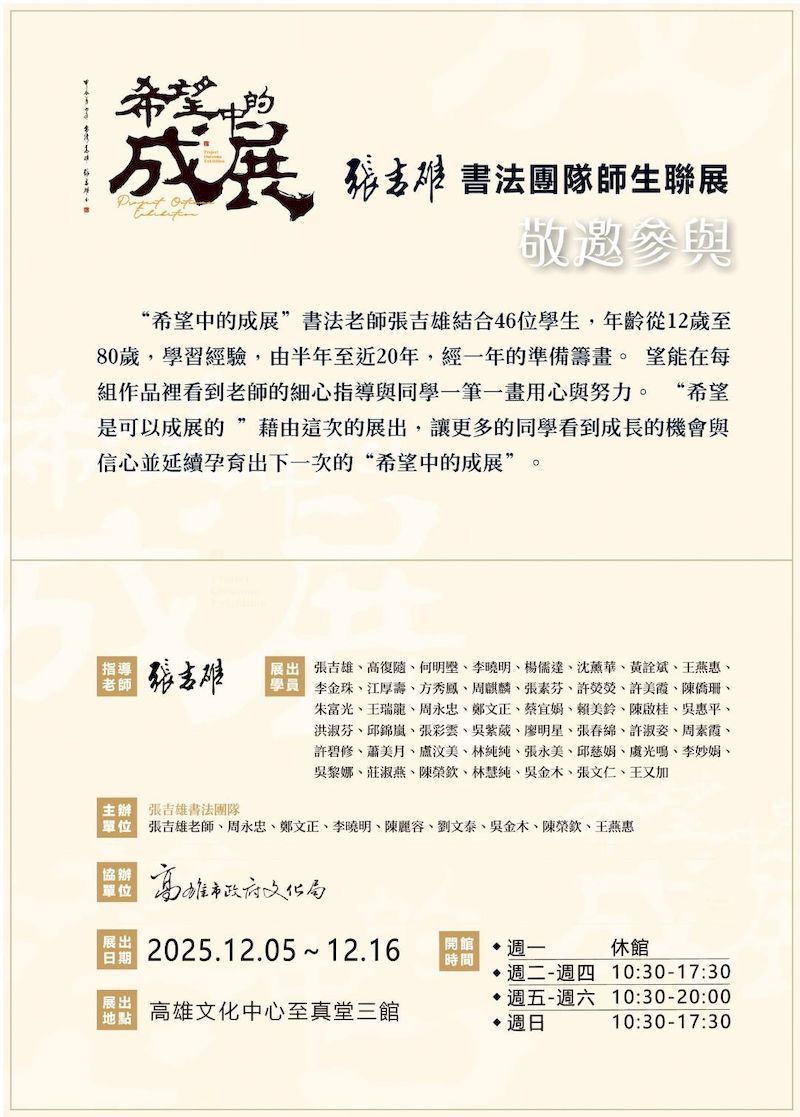 張吉雄師生書法聯展「希望中的成展」將於12/6高雄文化中心至真堂三館展出 2025/11/28 - 張永漢報導 - 【記者張永漢/高雄報導】「希望中的成展」由書法老師張吉雄帶領 46 位學生共同參與,參展者年齡橫跨 12 至 80 歲,學習書法的時間從半年到近 20 年不等。...