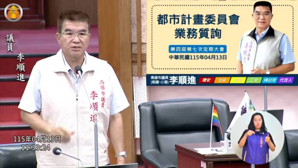 高雄市議員李順進轟南高雄發展失衡 籲機場地下道納二期工程、加速舊城翻轉 2026/04/14 - 楊尚義報導 - 【記者楊尚義/高雄報導】高雄市議會13日進行都市計畫委員會業務報告與質詢,高雄市議員李順進再度為小港、前鎮發聲,直指城市發展出現明顯落差,以「只見新人笑,不見舊...