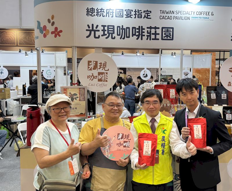 展館特別精選全臺近三十家優秀的國 產咖啡與可可莊園品牌,從產地到餐桌「From Farm to Table」,全面展現臺灣 農業的精緻實力與文化深度。 開幕典禮貴賓雲集,由農業部農糧署黃昭興副署長、農業部茶及飲料作物改 良場蘇宗振場長、台灣咖啡協會吳怡玲副理事長、台灣可可與巧克力產業協會張 翠蘭理事長,以及主辦單位台灣咖啡品質研究策進協會黃宥澄理事長等人共同出 席。