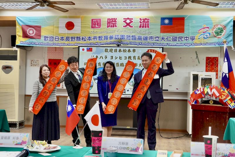 迎賓活動中,大仁國中校長方靜慧與家長會會長楊淑妃特別致贈以「日本松本」為句首的春聯創作給松本市教育長曾根原好彥及信明中學校長丸山剛生,寓意精進成長、仁心行事,獲得日方貴賓高度肯定。另於高雄市政府教育局歡迎晚宴中,也邀請吳立森局長一同致贈中堂,誠摯祝賀曾根原好彥先生榮升松本市教育長,象徵台日教育夥伴關係持續深化、攜手前行。
