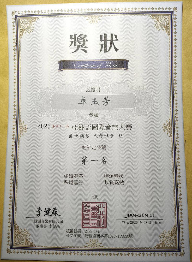 台鋼科技大學休閒運動管理系三年級卓玉芳同學,日前參加2025年亞洲盃音樂大賽,台風表現穩健,憑藉理查·克萊德曼《星空的鋼琴手》,榮獲爵士鋼琴組第一名佳績,表現優異,消息傳回學校,全校師生歡欣不已,為她的表現感到驕傲與榮耀。