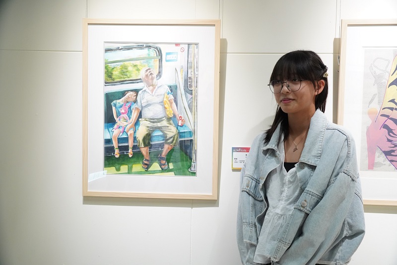 繪畫組優選的劉同學,這已是她第二次獲獎。這次她以作品〈歇息〉再度脫穎而出,畫中以細膩筆觸描繪長者與孩童在車上依偎小憩的溫馨畫面,光影自然流暢、情感真摯動人,充分展現她對生活細節的敏銳觀察與成熟的色彩掌握。令人印象深刻的是,每一次她都在收件日之前就迫不及待地將作品送到協會,展現對創作的熱情與積極態度。母親分享道,劉同學已經在和老師討論明年學藝競賽的創作方向,足見她對繪畫的用心與持續努力。