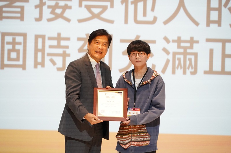 作文類特優的莊同學,家中為單親家庭,由阿公阿嬤照顧長大,她從小喜歡閱讀,經常從書中汲取靈感與想法,也因此在寫作方面展現出獨特的思考與文字表達力。這次得獎作品中,她寫道:「快樂不是盛大的節日,而是一場沒人發現的革命。」這句話不僅提醒自己,也啟發我們——快樂有許多種形式,而發自內心的幸福最為真實可貴。